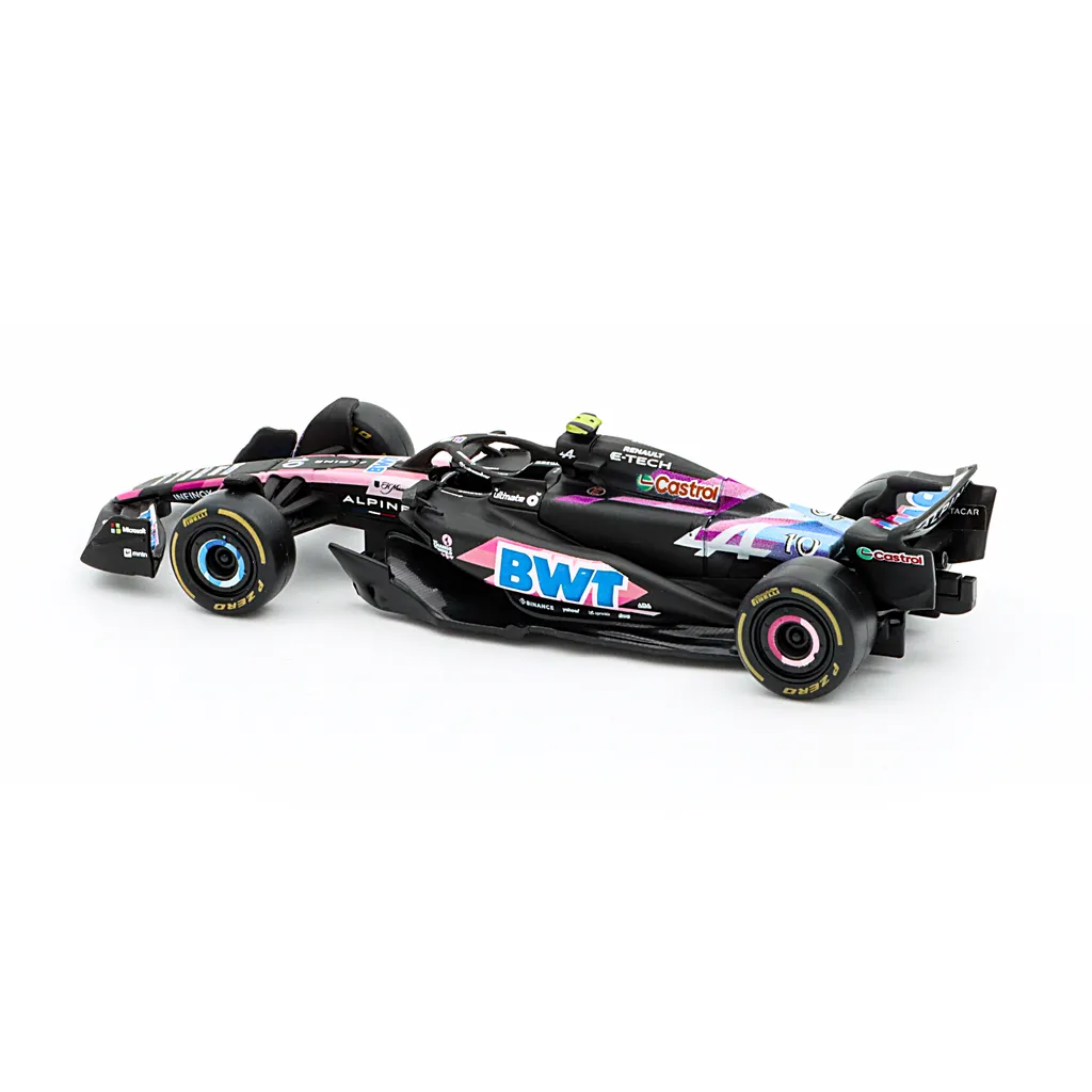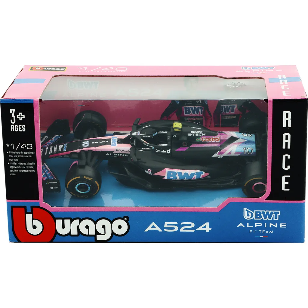 Alpine A524 med nummer 10 kördes av Pierre Gasly under F1-säsongen 2024. Den här leksaksmodellen är tillverkad av Bburago i skala 1:43 vilket innebär att den är 13 cm lång.