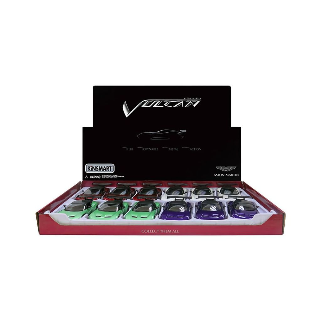 Aston Martin Vulcan från Kinsmart för lek eller samling. Skalan är 1:38 och leksaksbilen finns i flera färger. Öppningsbara dörrar och pullback.