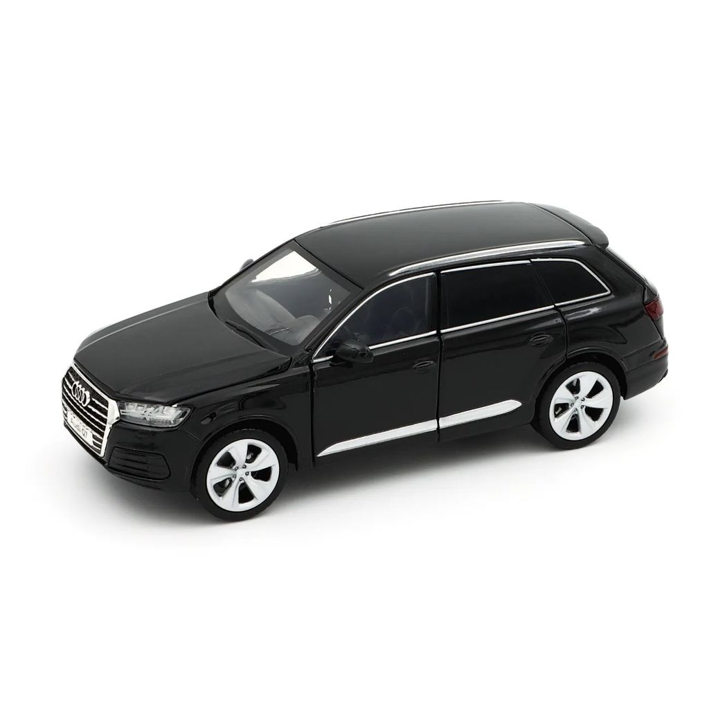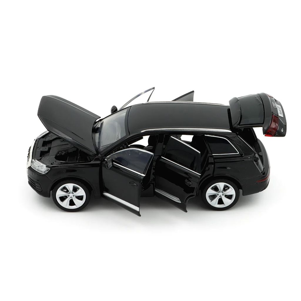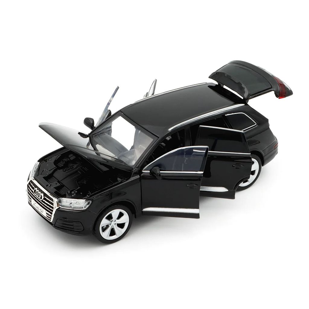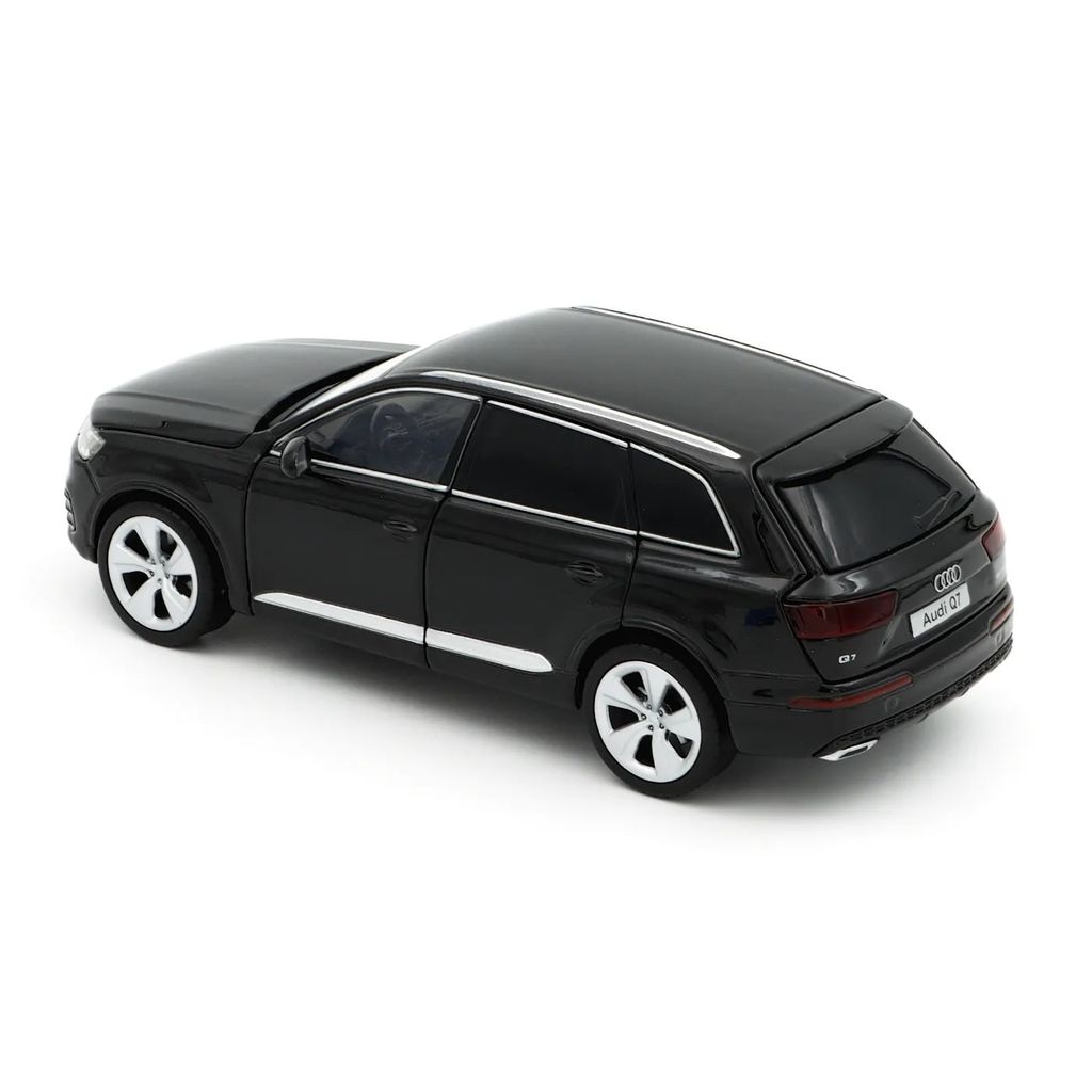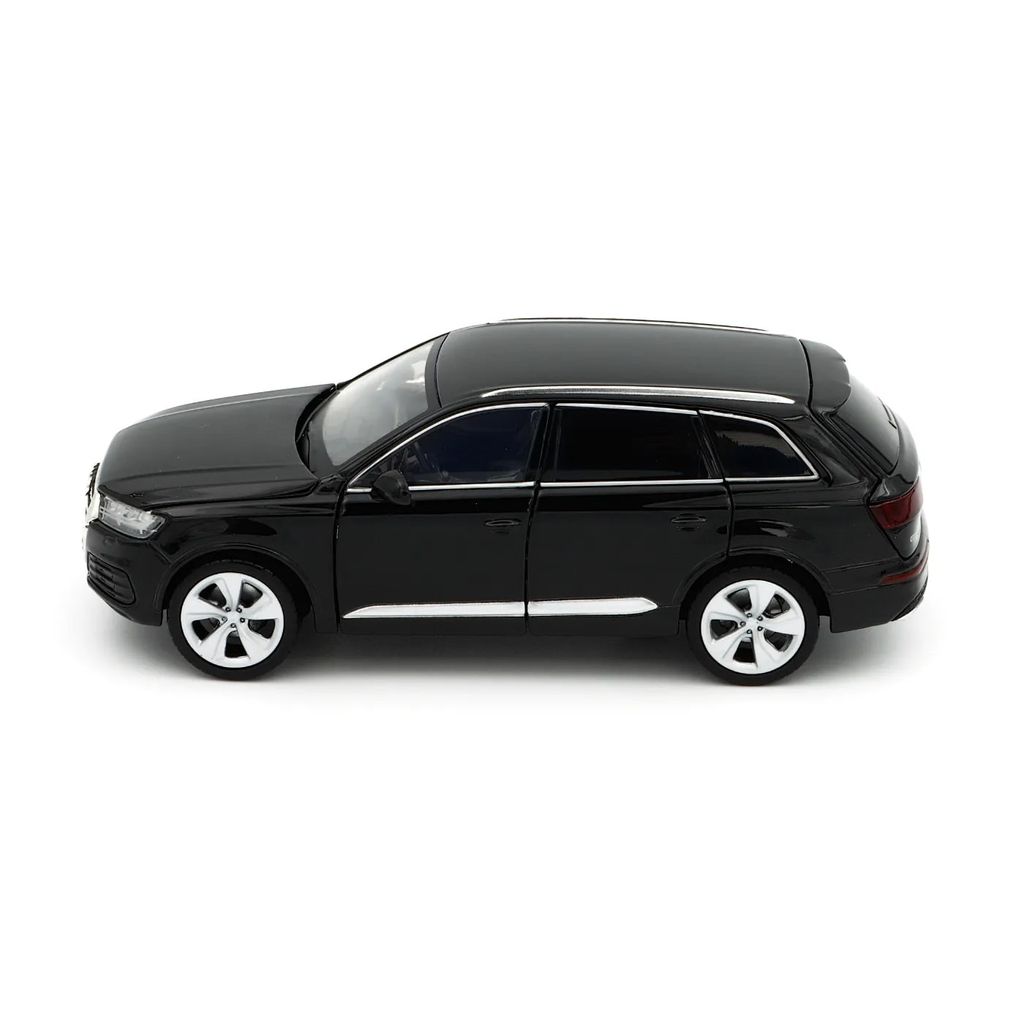 Svart (Night Black) Audi Q7 som modell från Tayumo i skala 1:32 (15 cm). Bilen har ljud- och ljusfunktioner samt pullback.