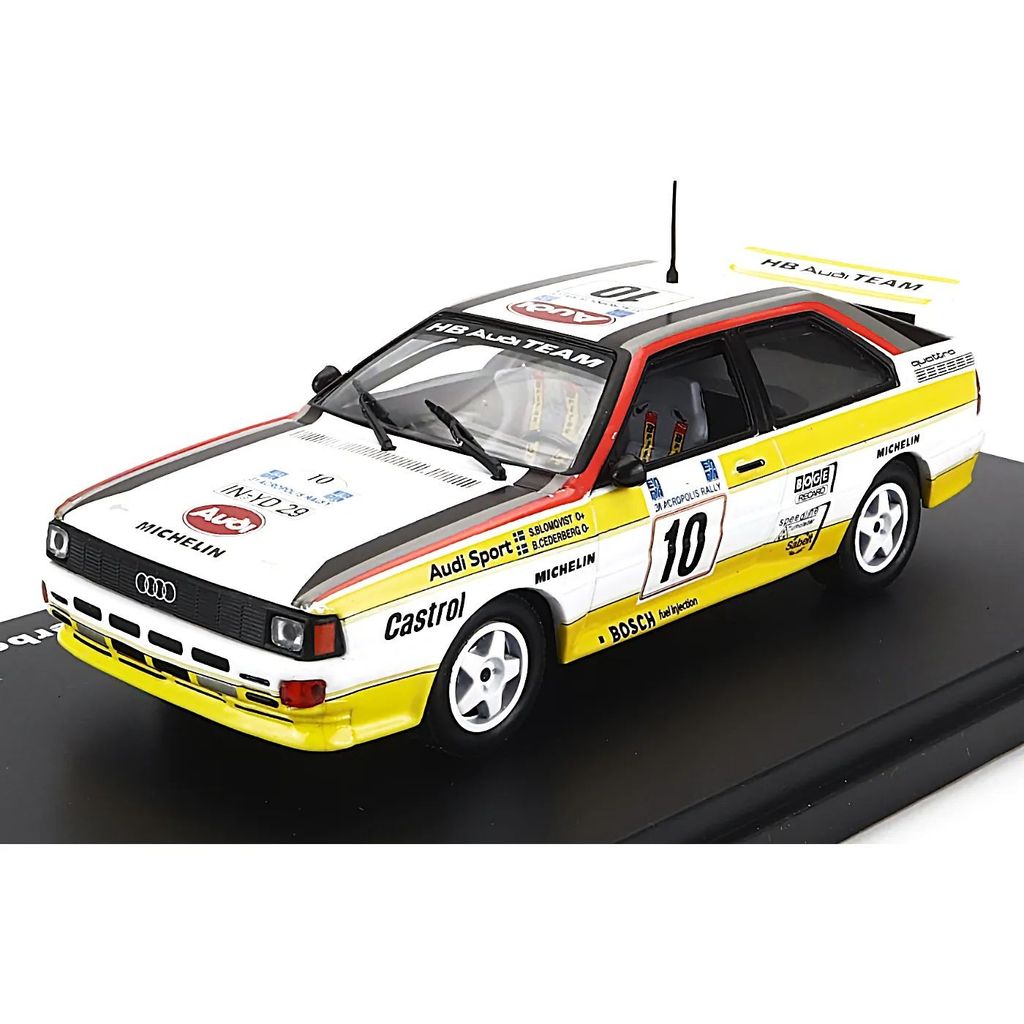 Denna Audi Quattro A2 med nummer 10 kördes av Stig Blomqvist och Björn Cederberg när de vann Akropolisrallyt i Grekland 1984. Bilen är en modellbil i skala 1:43 (10,5 cm).