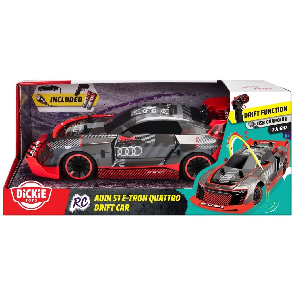 Radiostyrd driftbil i form av en Audi S1 E-Tron Quattro från Dickie Toys. Audin är RTR (ready to run) vilket innebär att allt ingår för att köra. Batterier till kontrollen följer med i förpackningen och bilens batteri laddas med USB.