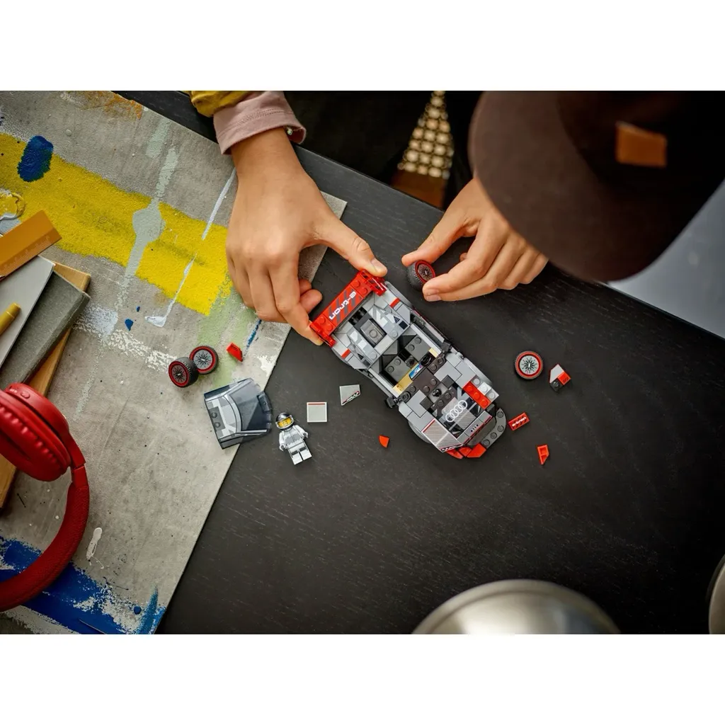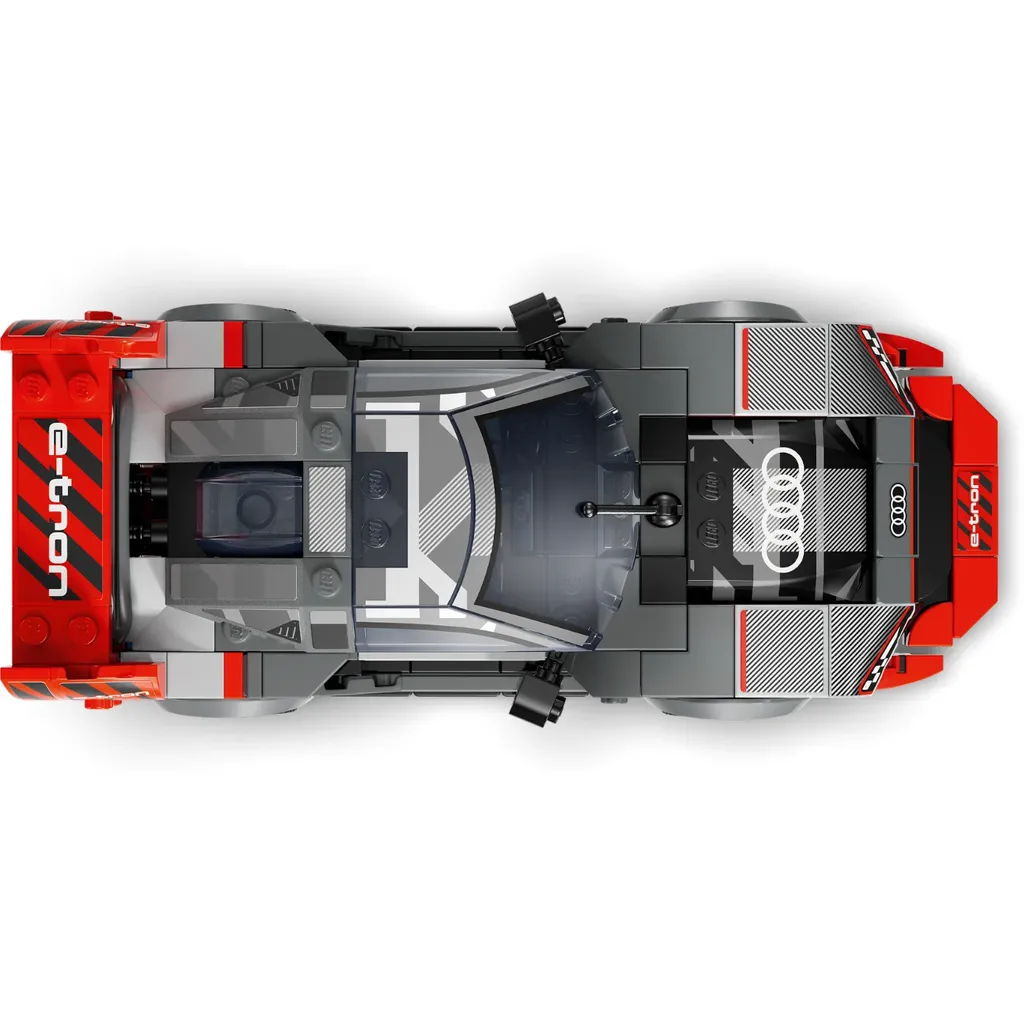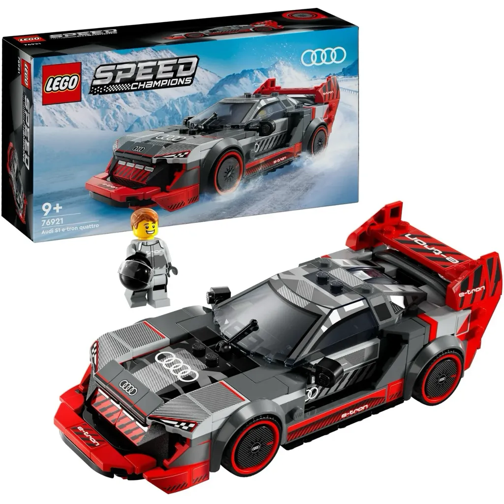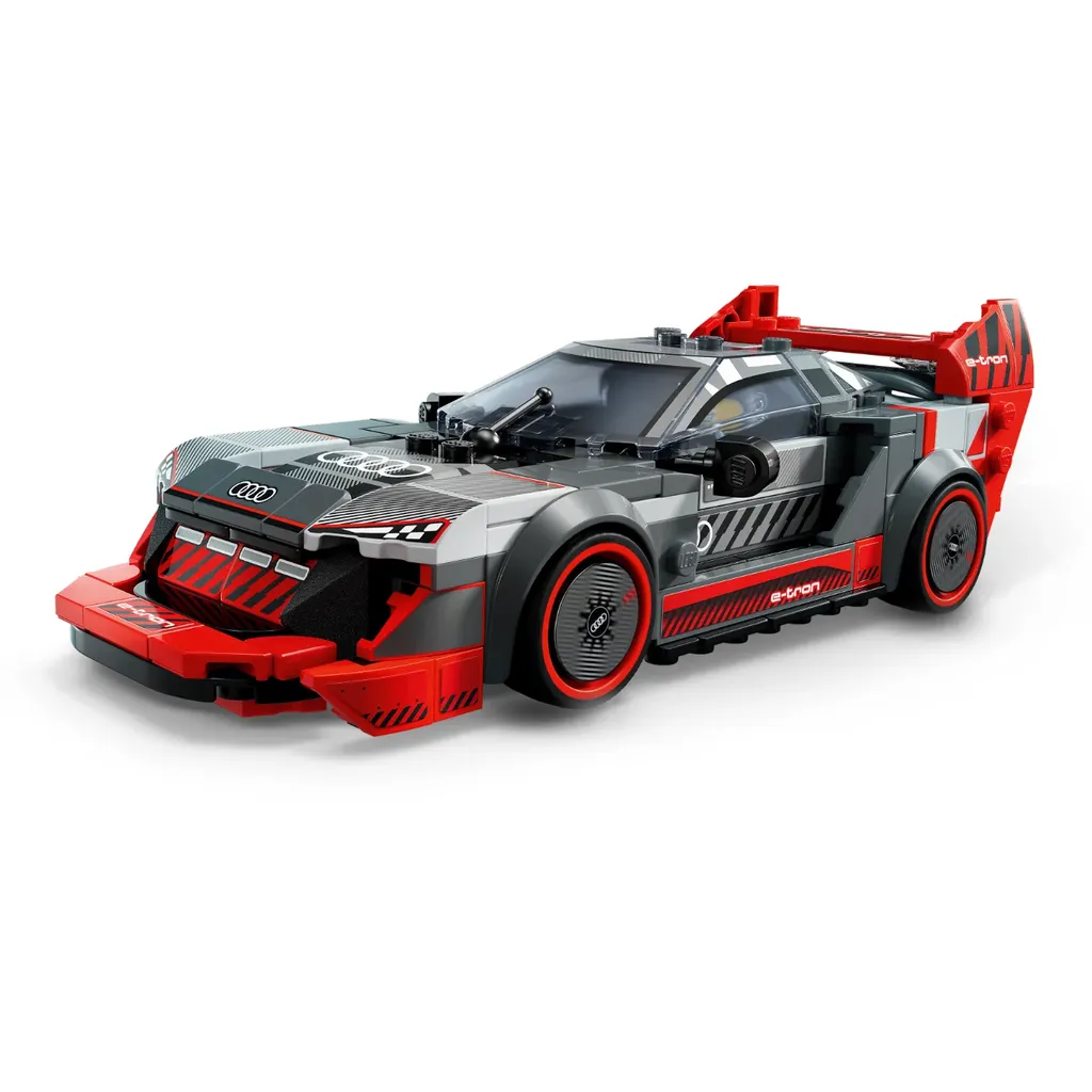 Audi S1 e-tron quattro från LEGO och serien Speed Champions. Audin är grå och röd. En minifigur som kan köra sportbilen medföljer.