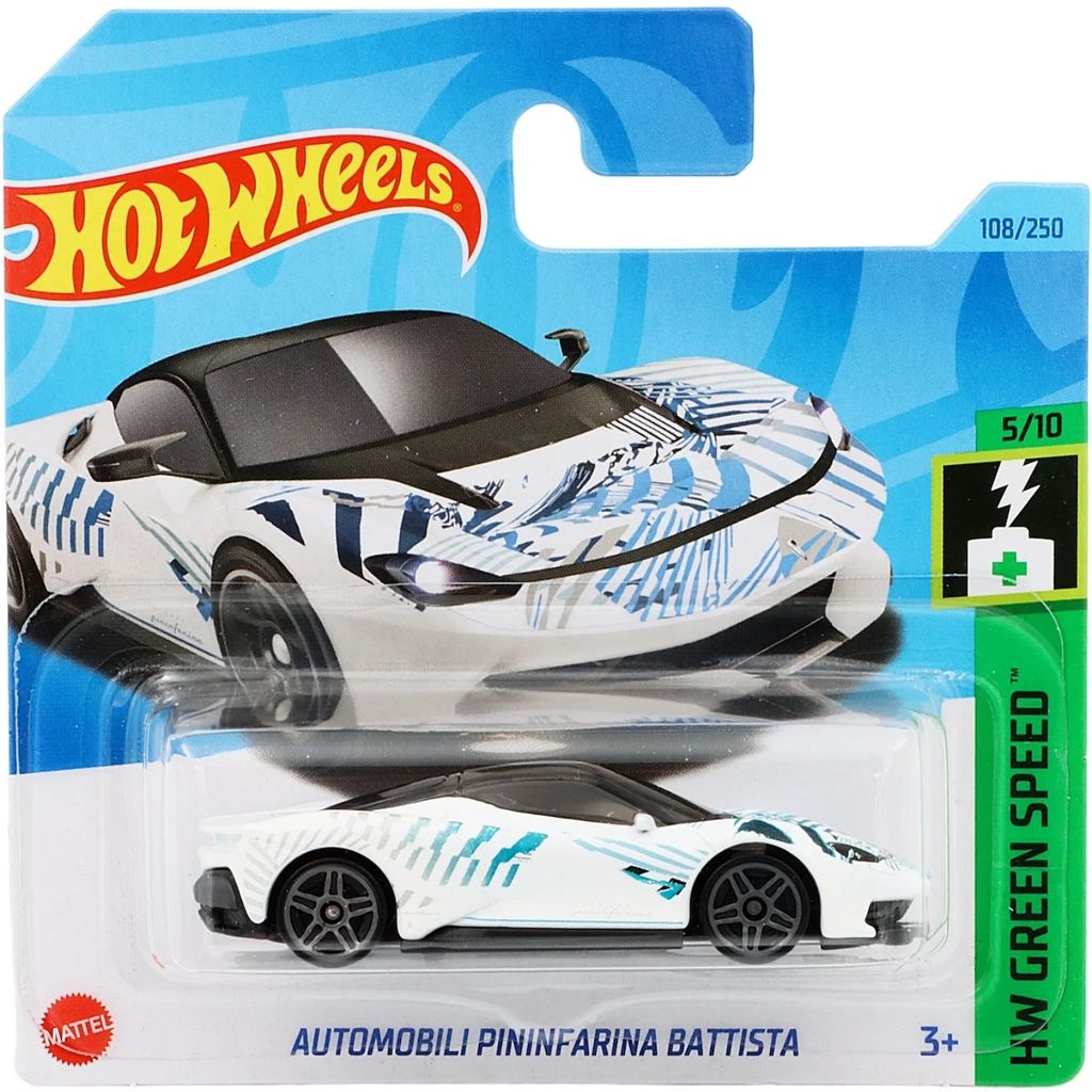 Automobili Pininfarina Battista från Hot Wheels och serien HW Green Speed där denna leksaksbil är bil nummer 5/10. Sportbilen är nummer 108/250 från 2023 och har ett short card (5785). Bilens artikelnummer är HKK22. Just denna bil ingår i bland annat L case 2023.