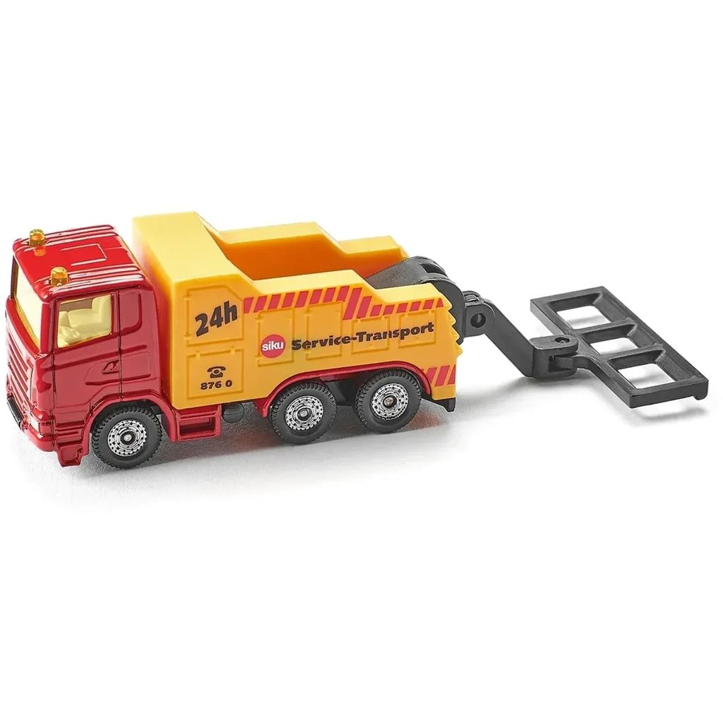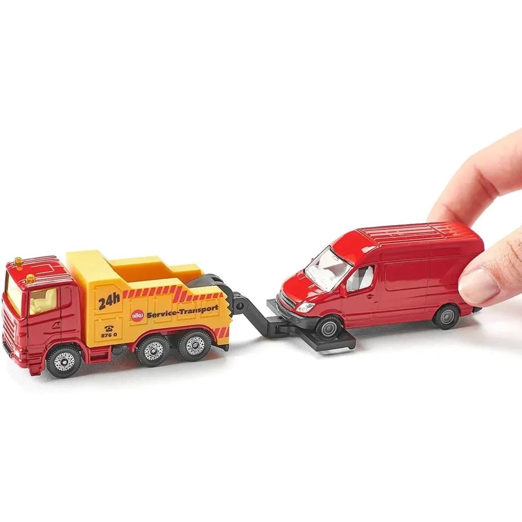 Bärgningsbil som bärgar en röd skåpbil / VAN. Produkten är tillverkad av Siku.