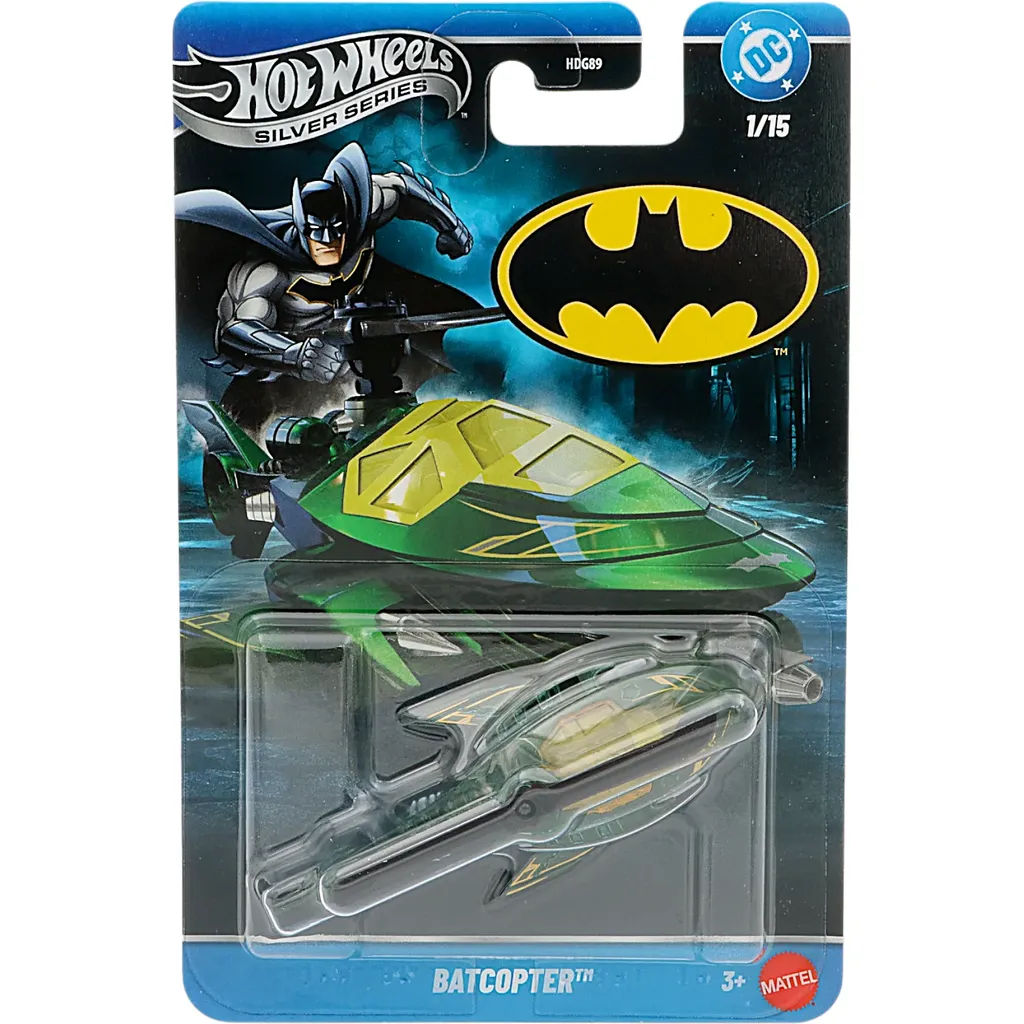 Grön Batcopter från Hot Wheels Silver Series och Batman Series från 2026 där denna Batcopter är fordon 1/15.
