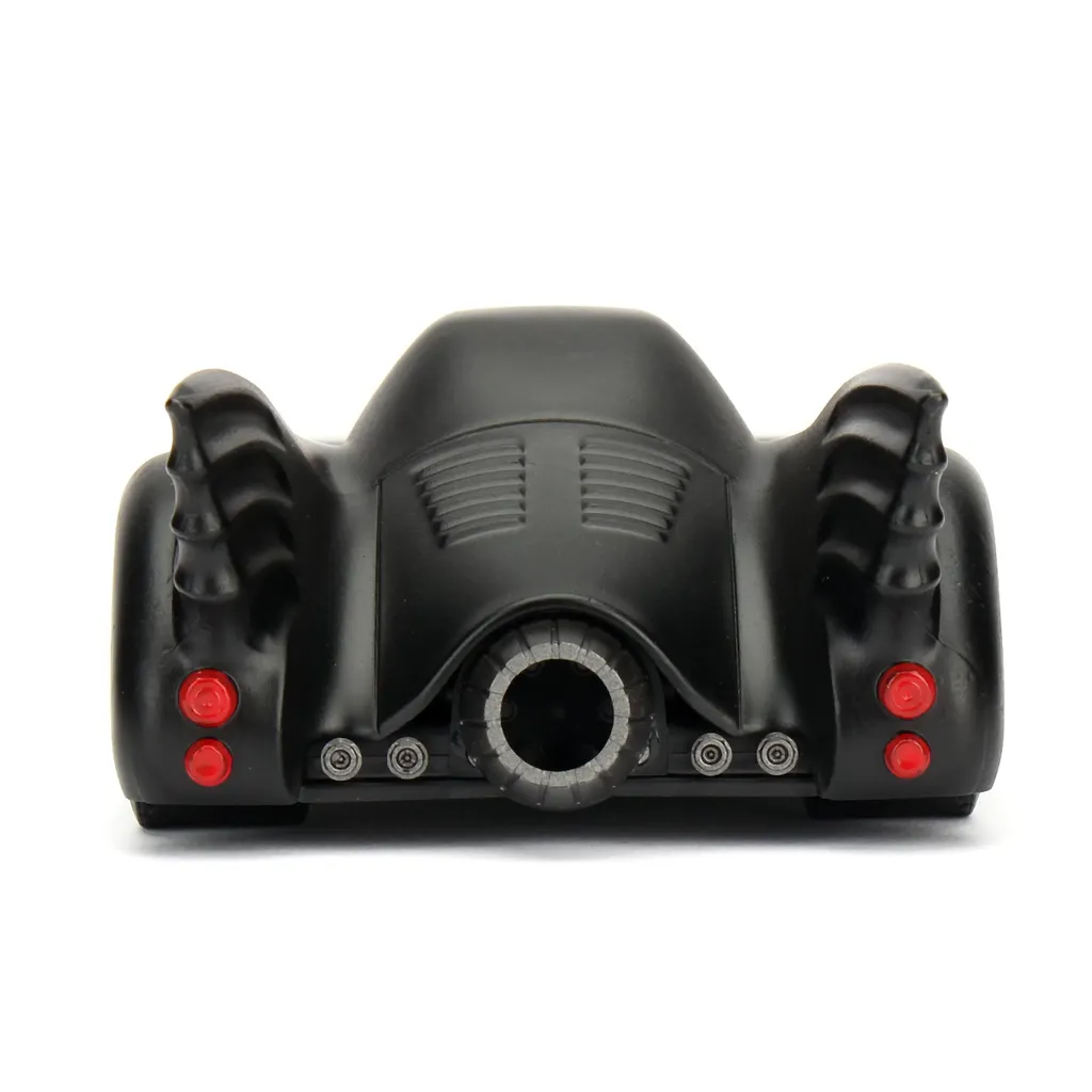 Ikoniska Batmobilen med lång framdel i en stilig mattsvart färg.