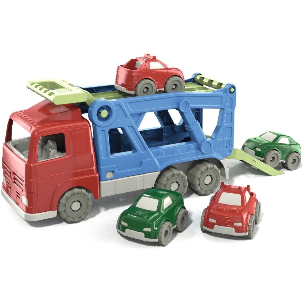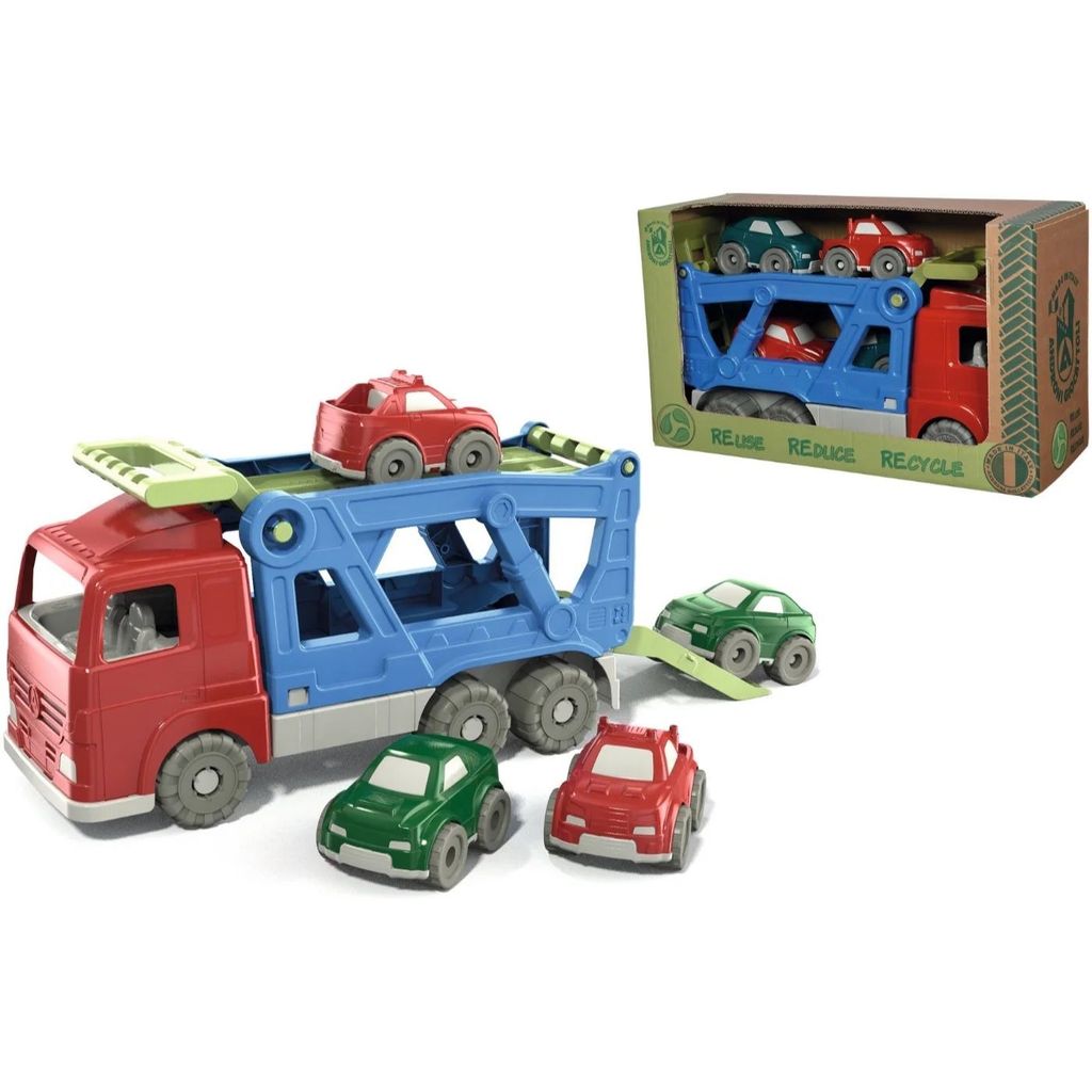 Biltransport, en lastbil, som transporterar 4 bilar på en biltrailer. Produkten är tillverkad av återvunnen plast i Italien av Androni Giocattoli. Produkten håller hög kvalitet med bra hållbarhet.