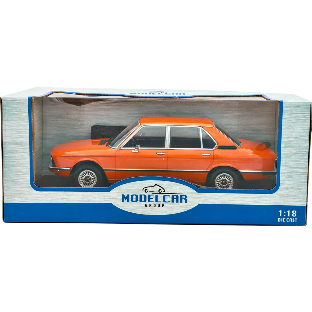 BMW 5-Series 520i (E12) i orange, årsmodell 1974, som modell från Modelcar Group. Modellbilen är i skala 1:18 (26 cm).