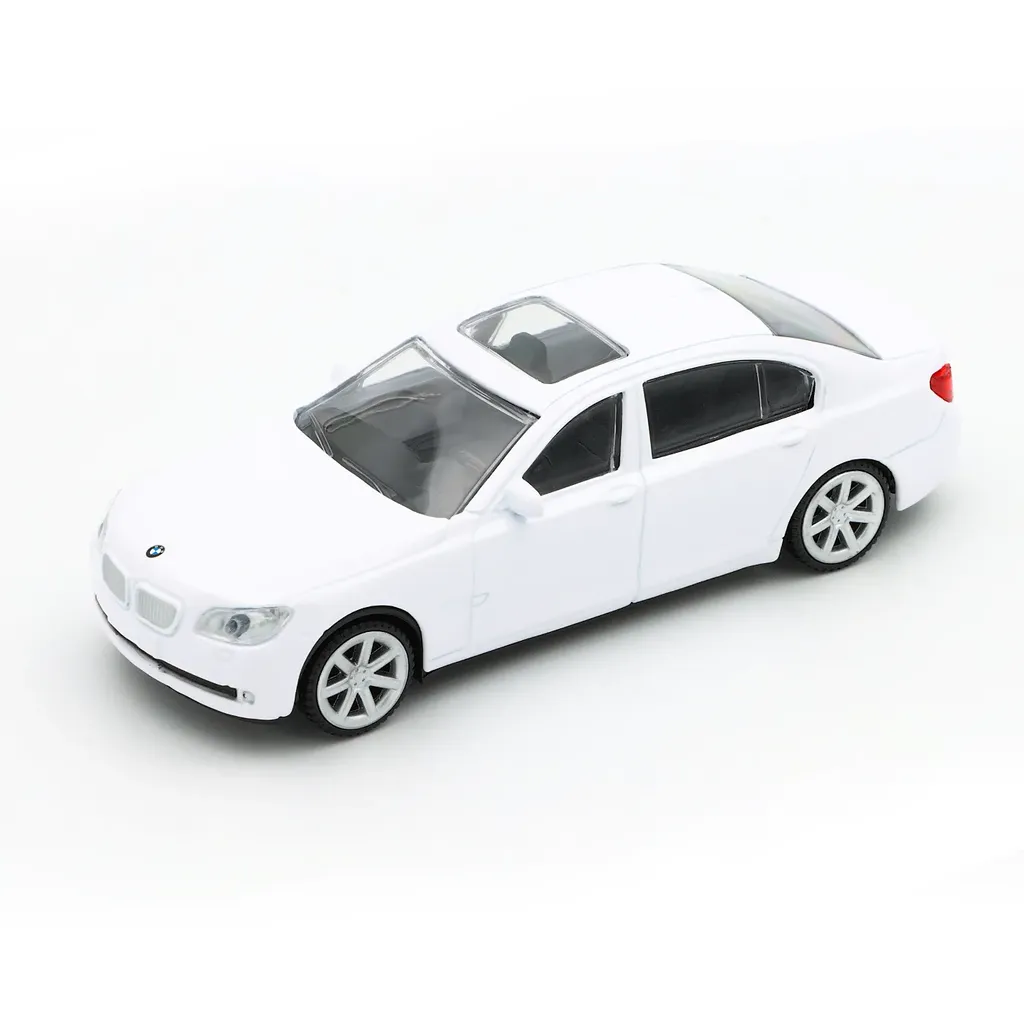 Vit BMW 750 Li som leksaksbil från Rastar. Bilen är 12 cm lång (skala 1:43).