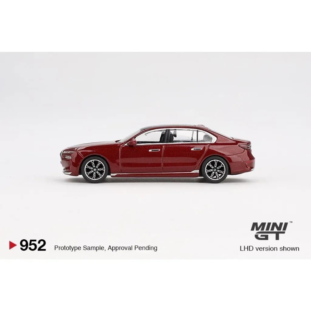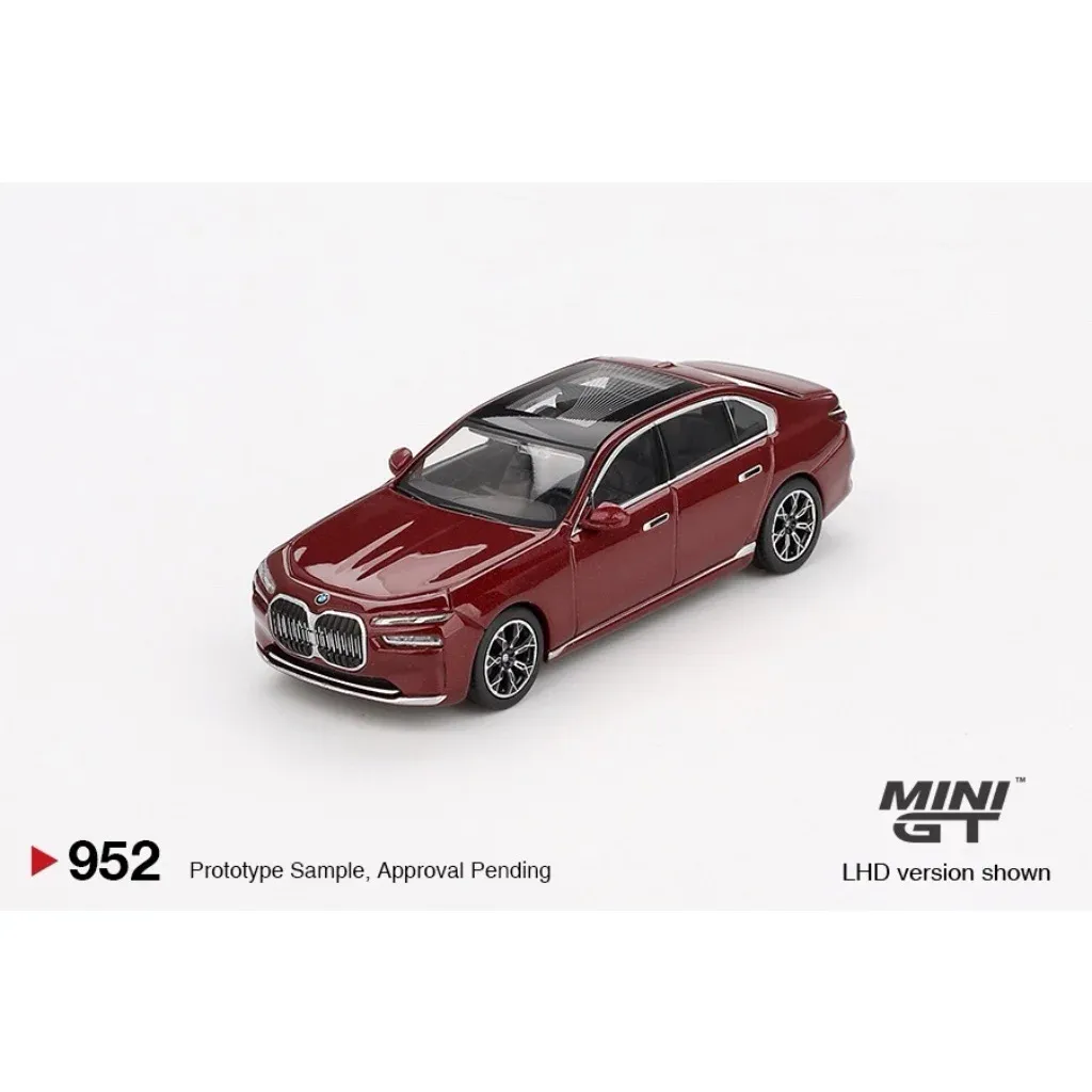BMW i7 xDrive60 som modell tillverkad av Mini GT i skala 1:64 (ca 7 cm). BMW:n är mörkröd (Aventurin).