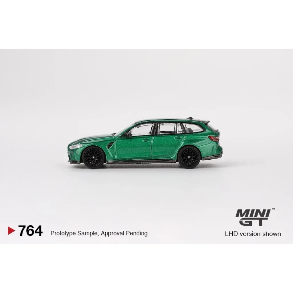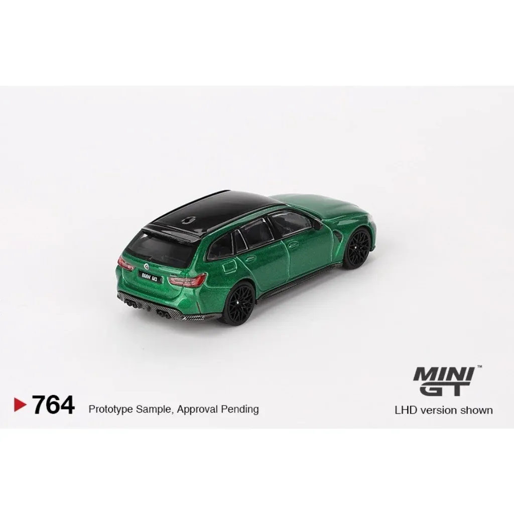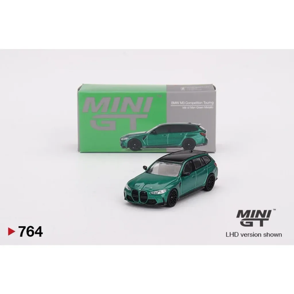 BMW M3 Competition Touring i grönt (Isle of Man Green Metallic) från Mini GT i skala 1:64 (ca 7 cm). Bilen har produktnummer 764 hos Mini GT. Den här versionen är vänsterstyrd (LHD) med ratten på vänster sida.