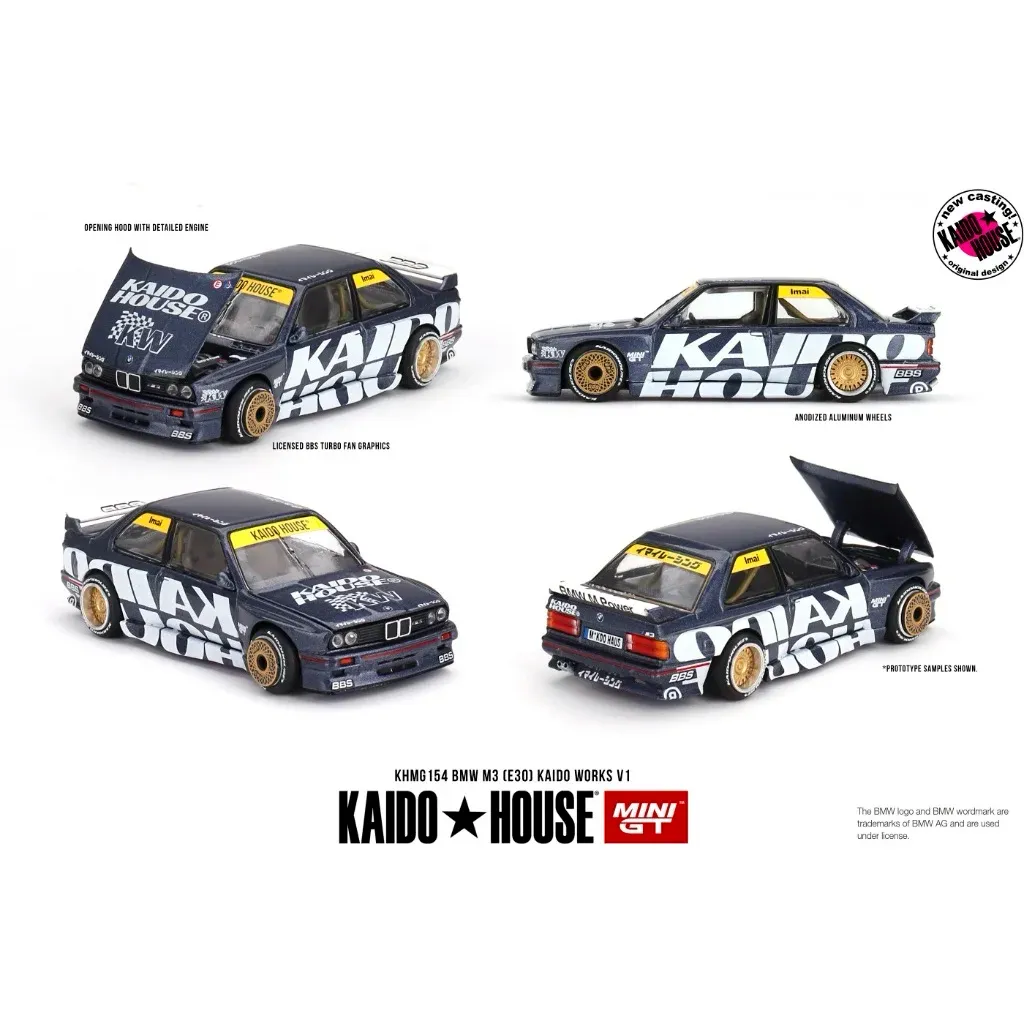 Blå BMW M3 (E30) Kaido Works V1 som modellbil från Mini GT och serien Kaido House.