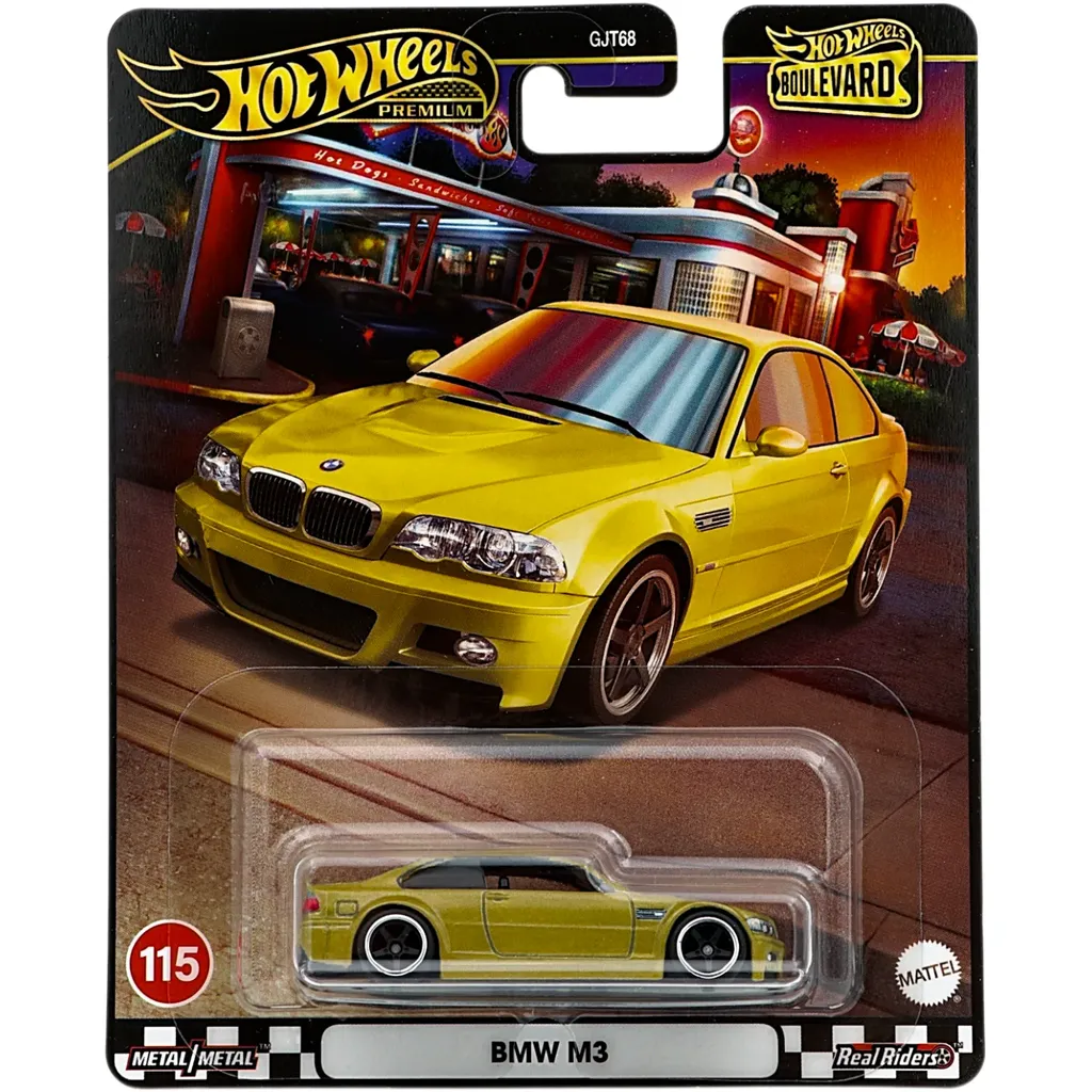 BMW M3 (E46) i en gulmetallic lack, åt det guldiga hållet, i skala 1:64 (7 cm) från Hot Wheels serie Boulevard där denna BMW är nummer 115.