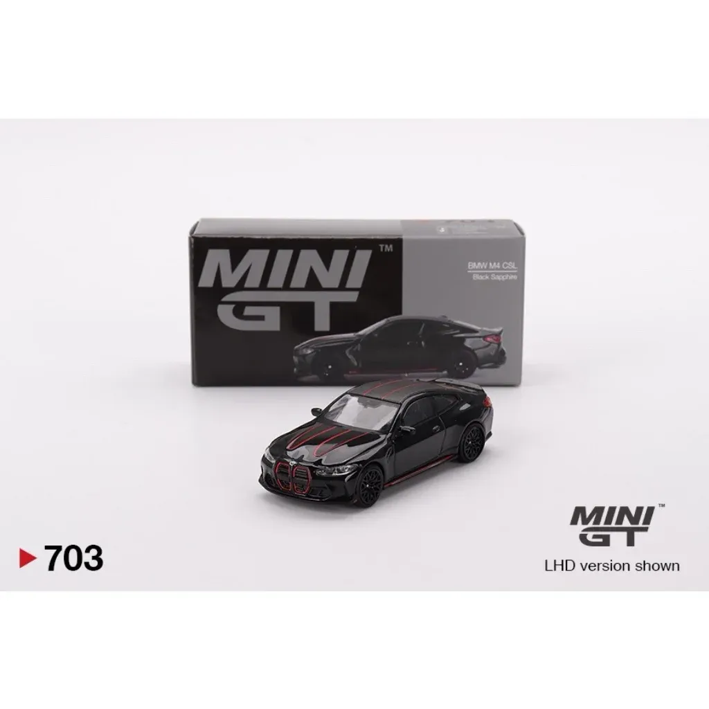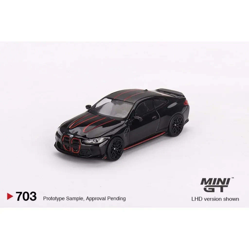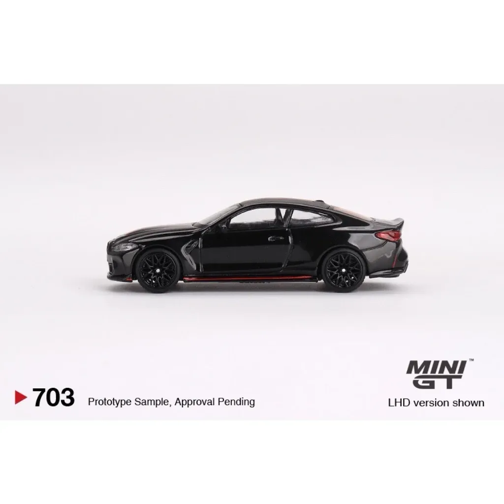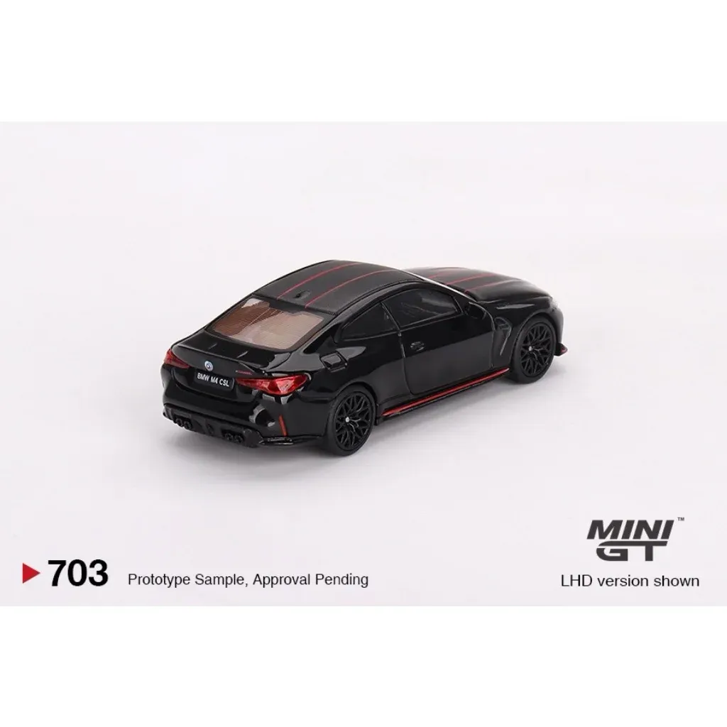 BMW M4 CSL i svart (Black Sapphire) med röda detaljer från Mini GT i skala 1:64 (ca 7 cm). Bilen har produktnummer 703 hos Mini GT. Den här versionen är vänsterstyrd (LHD) med ratten på vänster sida.