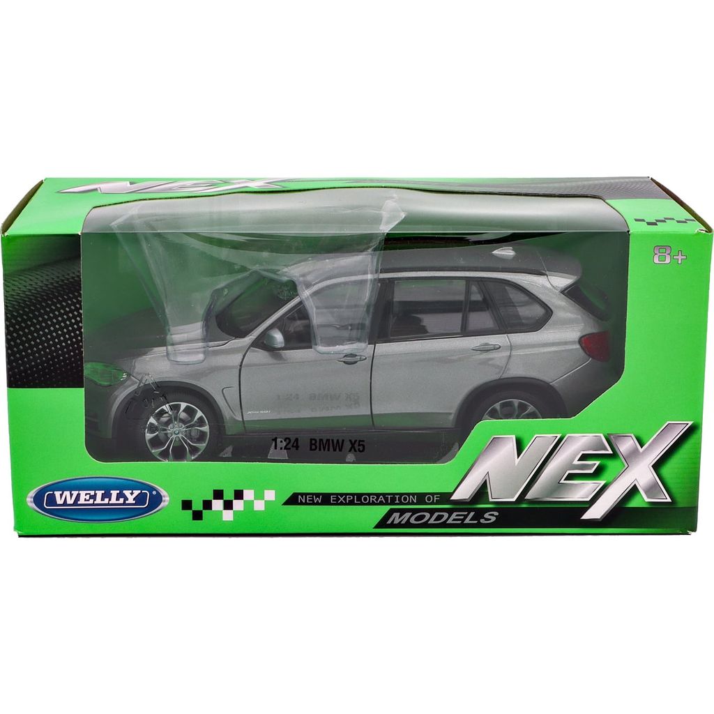 Grå BMW X5 (F15) från Welly och serien NEX Models i skala 1:24 (19 cm). Öppningsbara framdörrar och motorhuv.