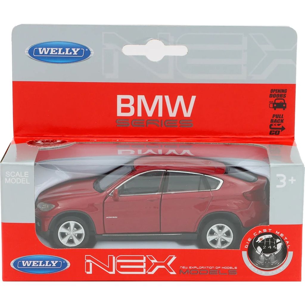 Röd / vinröd BMW X6, årsmodell 2011, från Welly. Öppningsbara framdörrar. Bilen är 11,5 cm (skala ca 1:34-1:39).