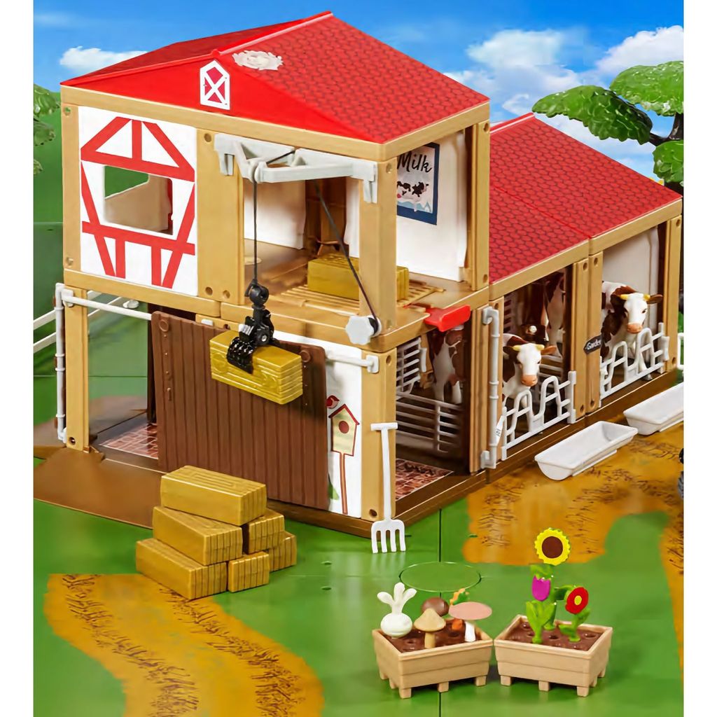 Det här en riktigt trevlig leksak för den som gillar att leka med små traktorer och driva ett eget lantbruk. Förutom bondgårdens alla delar medföljer en fyrhjuling från John Deere och 2 kor.
