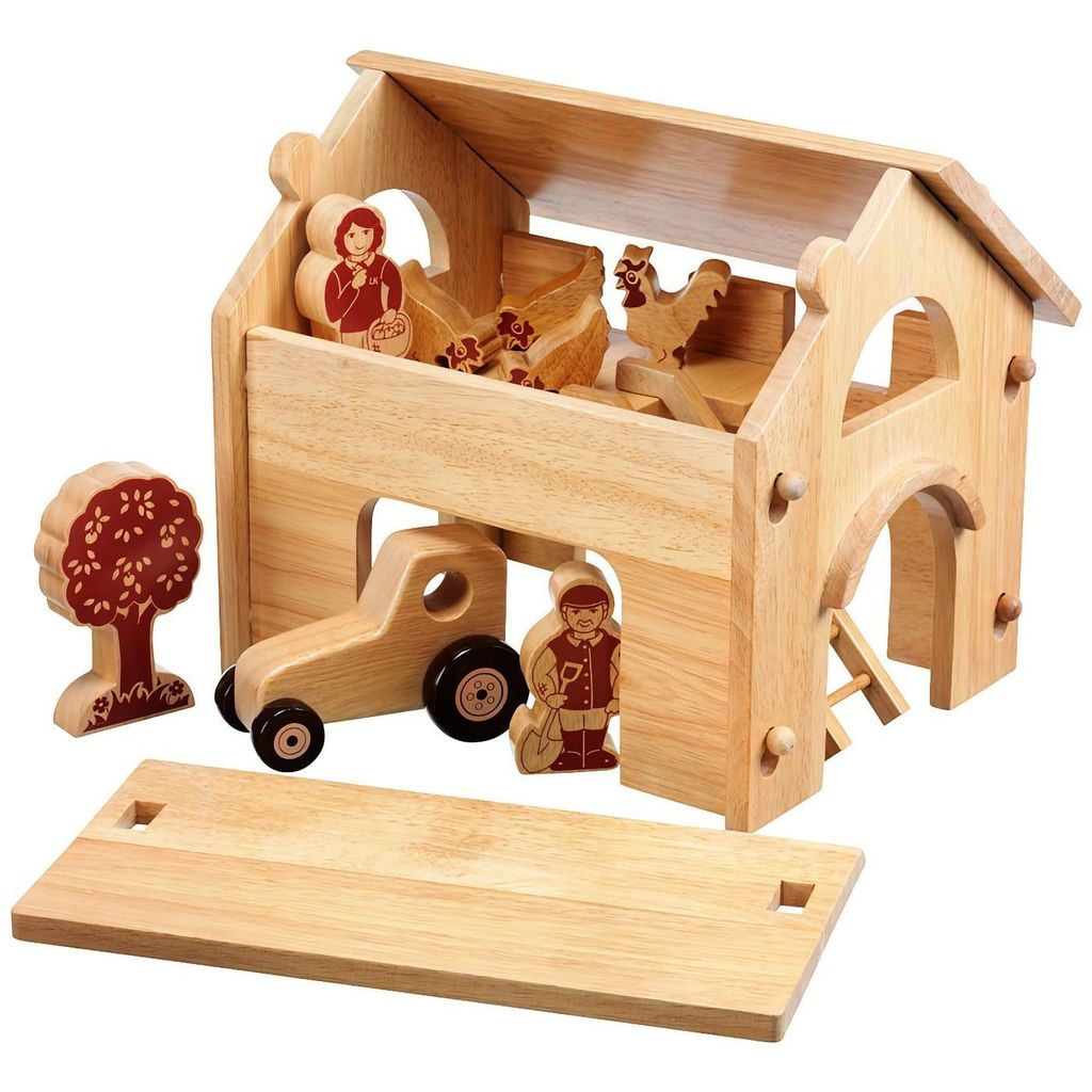 Från Lanka Kade kommer denna stora bondgård med ladugård i massivt trä tillverkat av hantverkare i Sri Lanka. Förutom ladugården och en traktor kommer leksetet med 34 tillbehör som samtliga listas nedan. Ladugårdens tak och stege är lösa delar och förhöjer lekvärdet då det enkelt går att leka med figurerna och de olika delarna inne i byggnaden.
