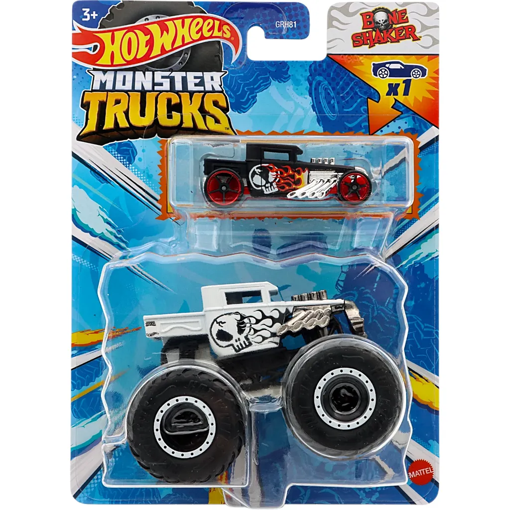 Bone Shaker som Monster Truck och som liten leksaksbil i detta 2-pack från Hot Wheels Monster Trucks.