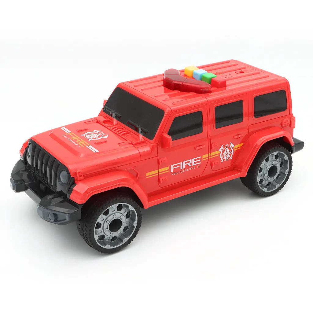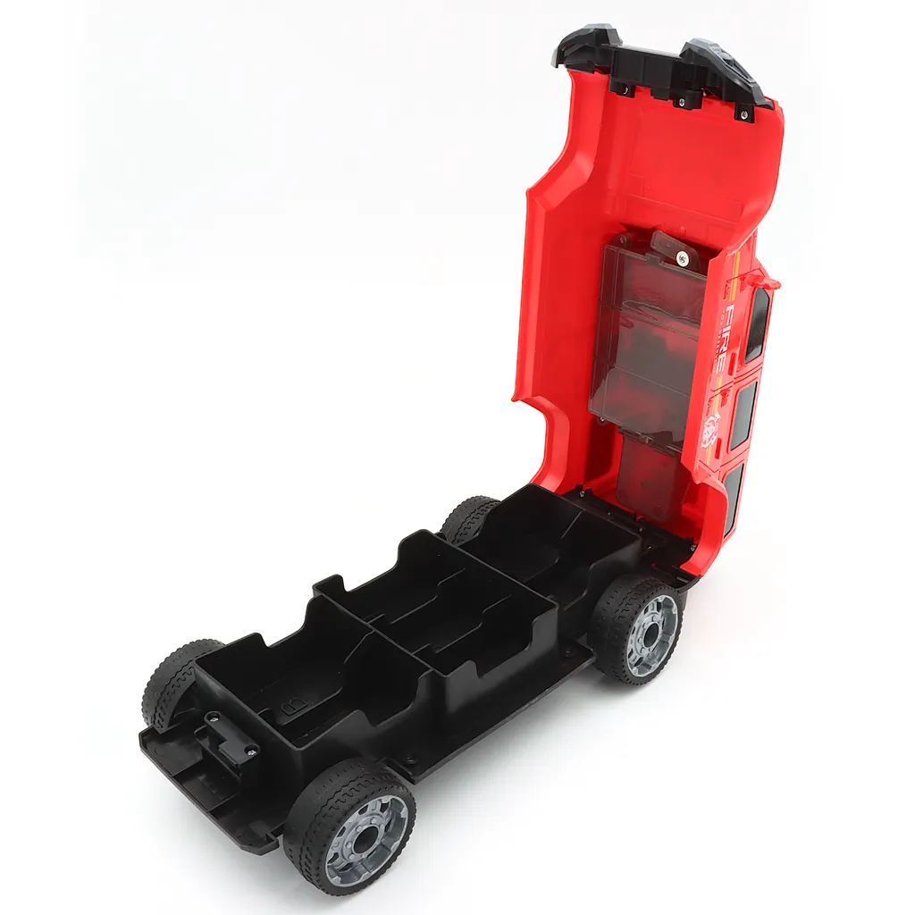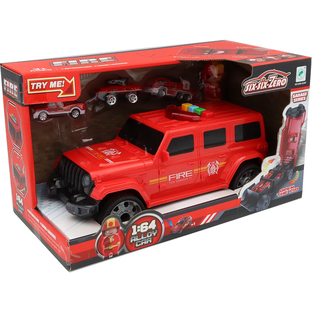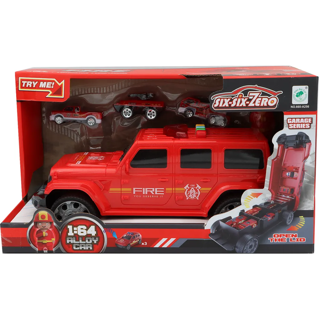 Röd brandbil / utryckningsfordon med ljud och ljus funktion. 3 st småbilar medföljer som man kan förvara inuti bilen och en liten gubbe.