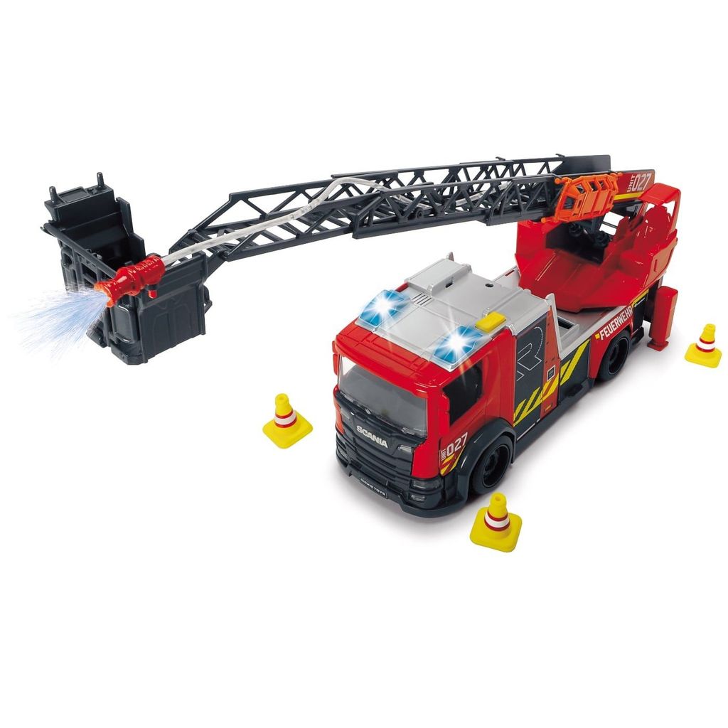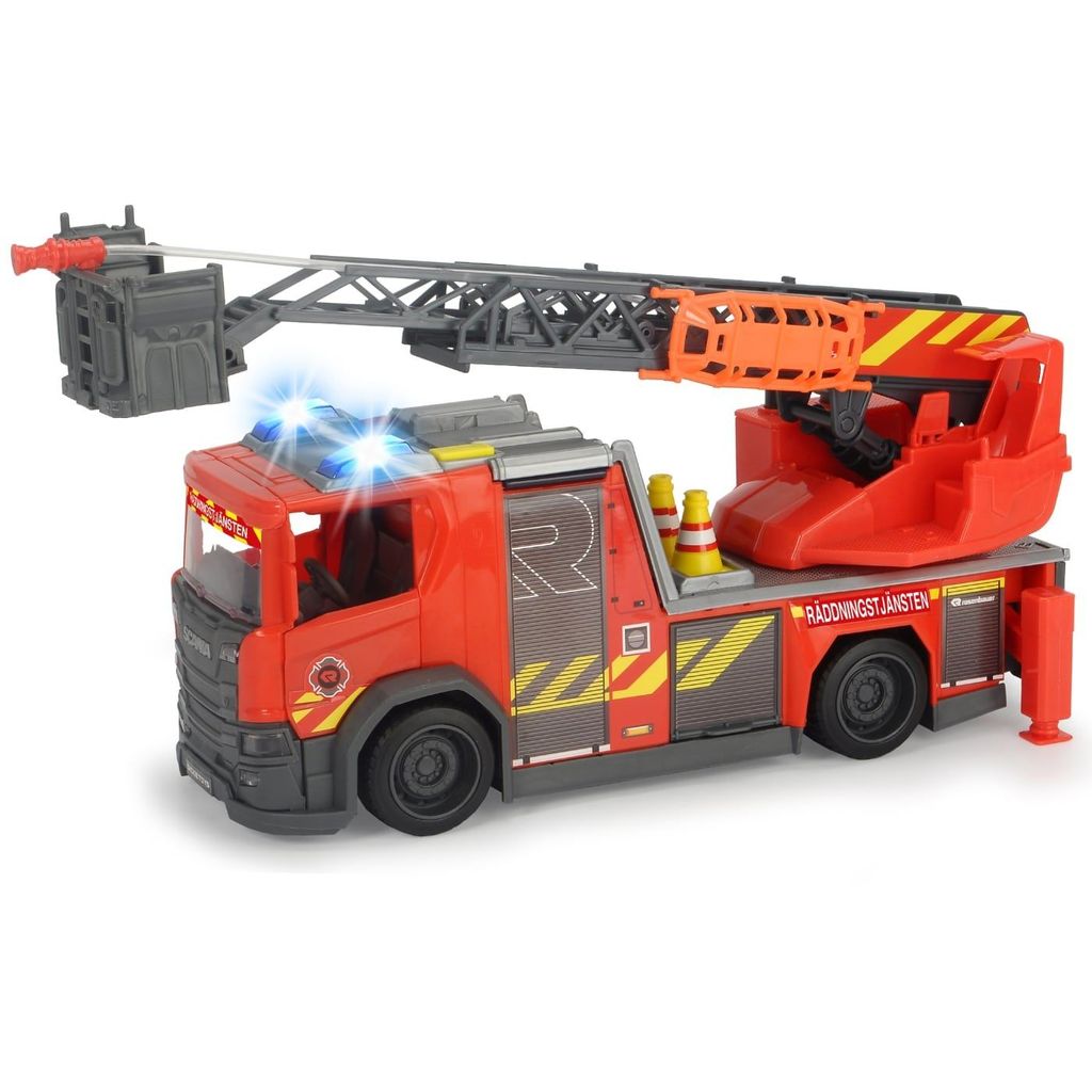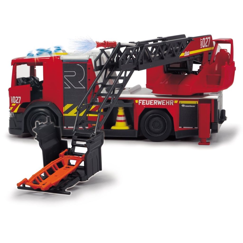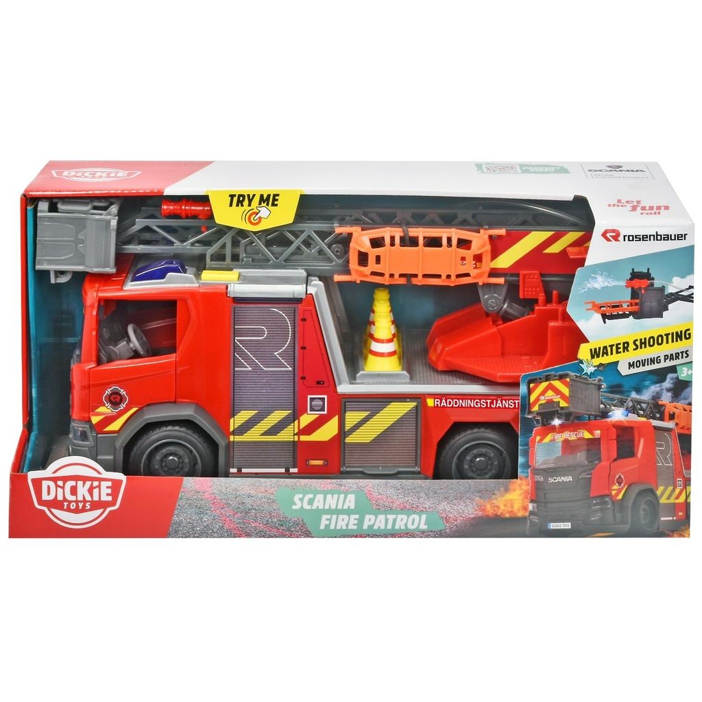 Brandbil med ljud, ljus och vattenspruta från Dickie Toys. Brandbilen som är en stegbil med arbetskorg är en Scania som utrustats av Rosenbauer. Leksaksbrandbilen är tillverkad av Dickie Toys under licens av Scania.