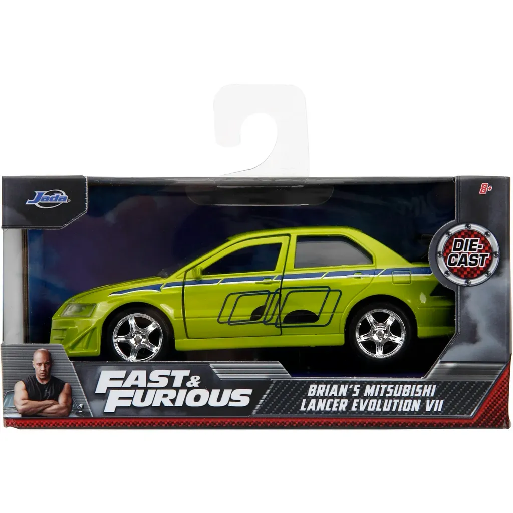 Brian's Mitsubishi Lancer Evolution VII, årsmodell 2002, från Fast & Furious-filmen 2 Fast 2 Furious från 2003. Bilen är limegrön och 13 cm lång (skala 1:32).