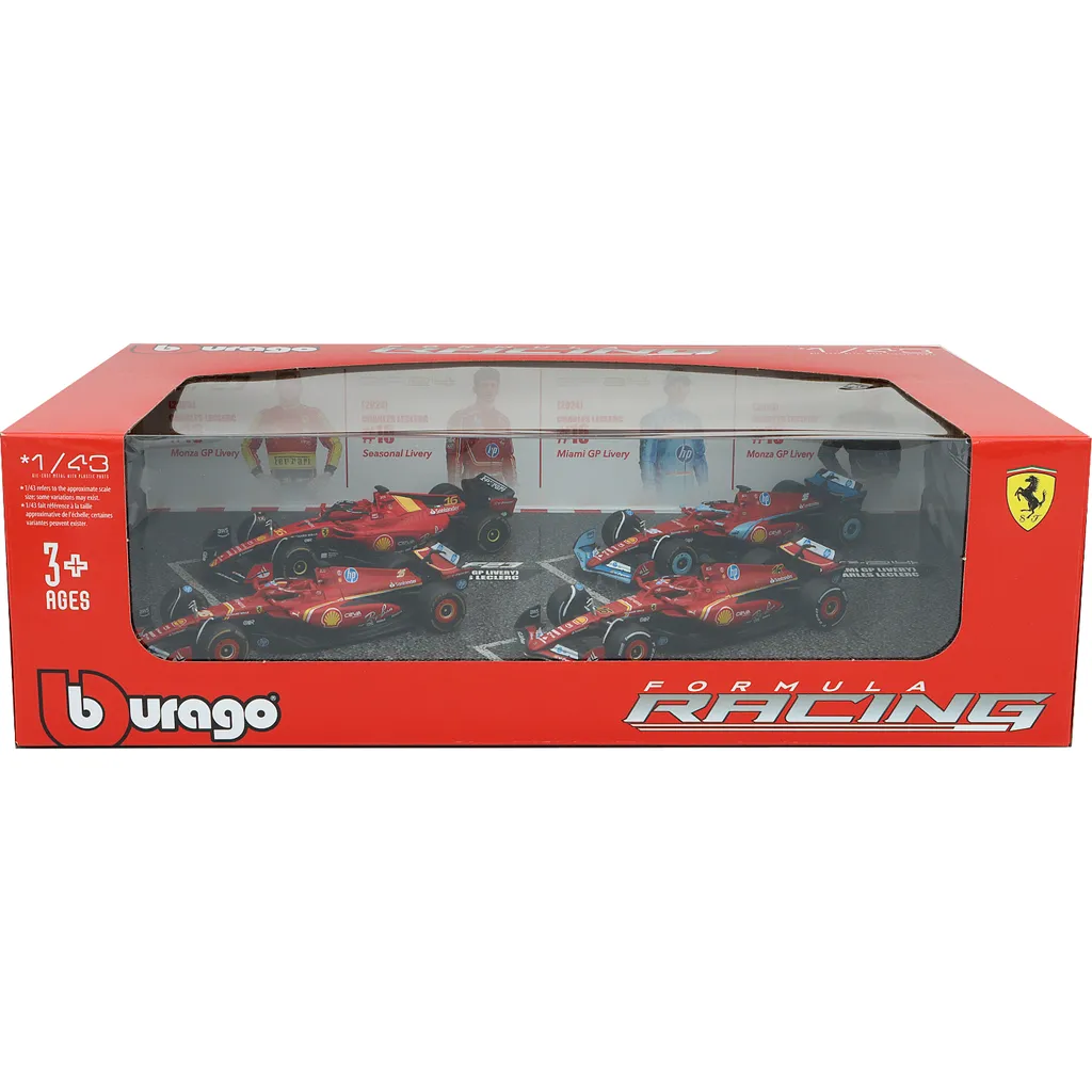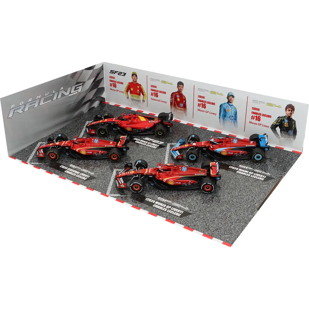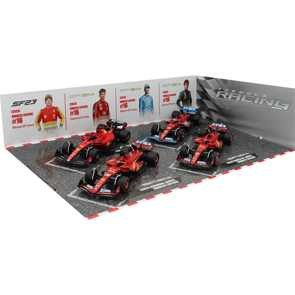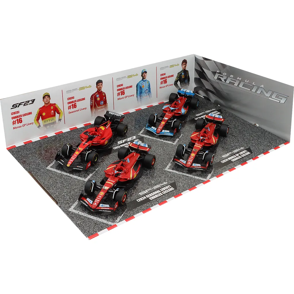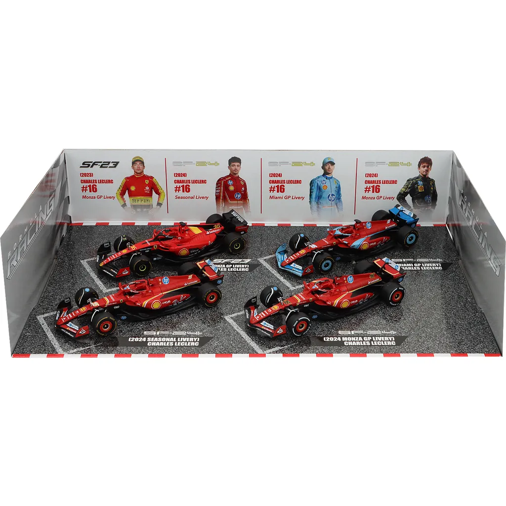 Set med fyra F1-bilar från Ferrari och F1-teamet Scuderia Ferrari / Scuderia Ferrari HP. Bilarna kördes av Charles Leclerc 2023 och 2024. Setet är från Bburago och skalan på bilarna är 1:43 (13 cm per bil).