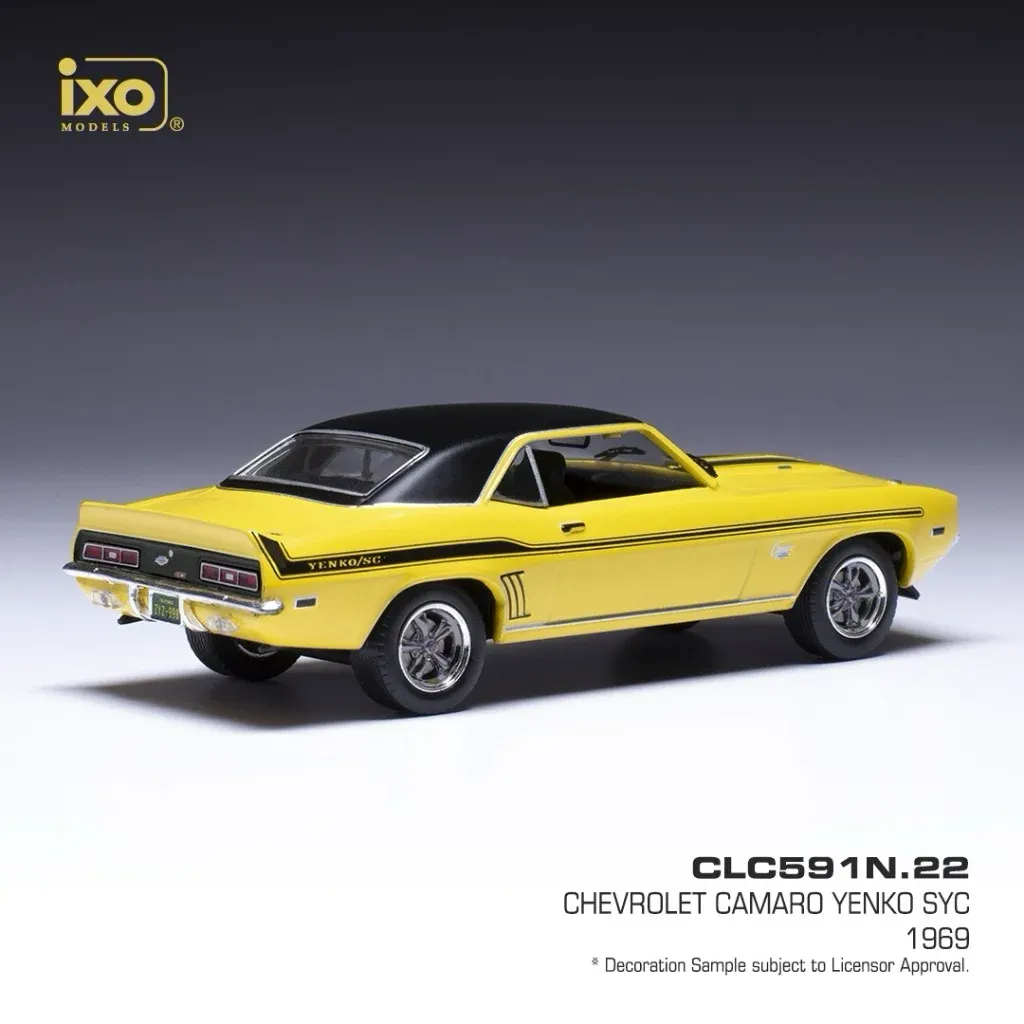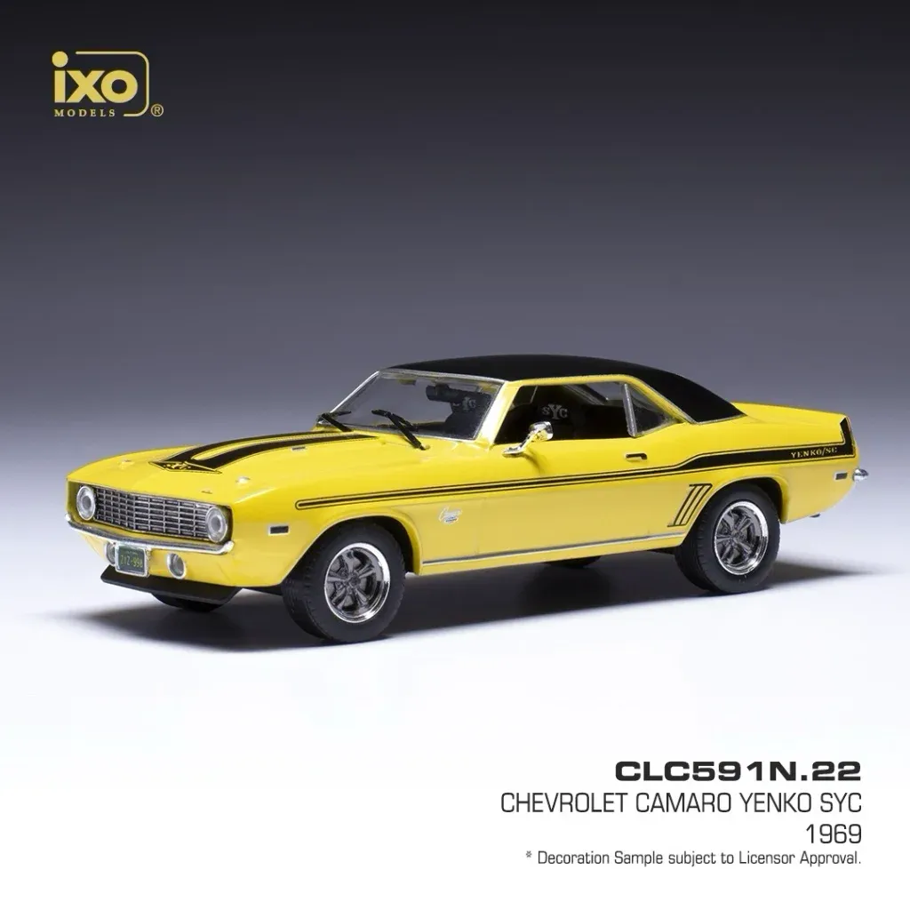 Chevrolet Camaro Yenko sYc (Yenko Super Car), årsmodell 1969, som modellbil från Ixo Models i skala 1:43 (11 cm). Gul lack med svart tak och svarta ränder.