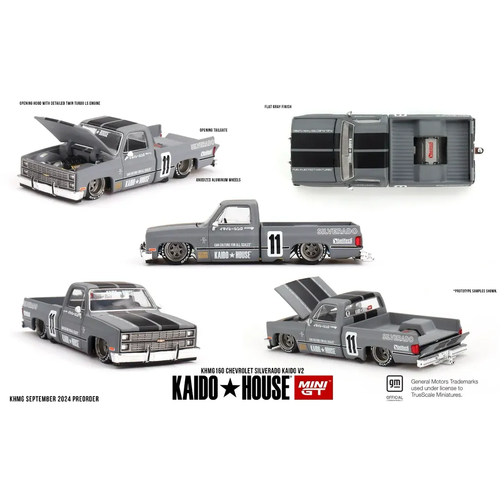Chevrolet Silverado Kaido V2 som modellbil från Mini GT och serien Kaido House. Modellen är tillverkad i metall med gummidäck och skalan är 1:64 (ca 7 cm). Bilen har en grå lack med vit dekor och nummer 11.