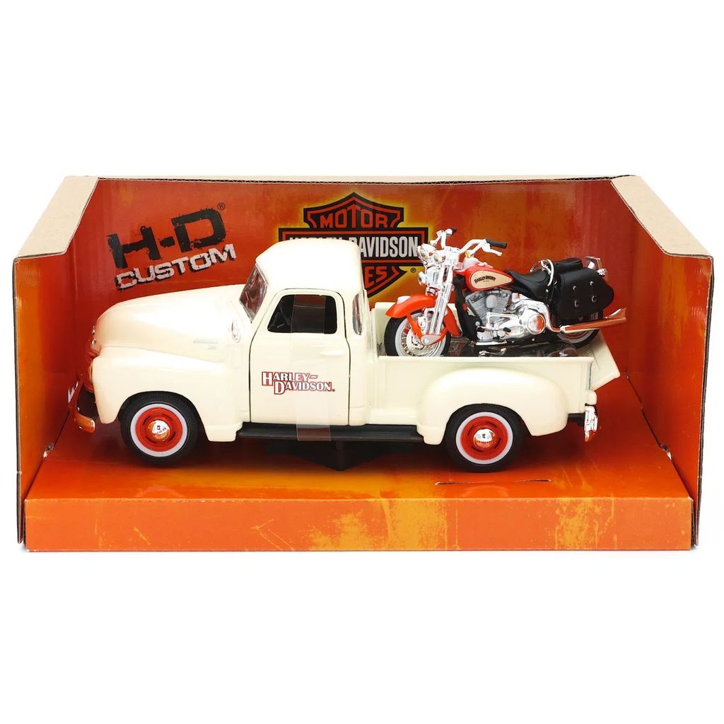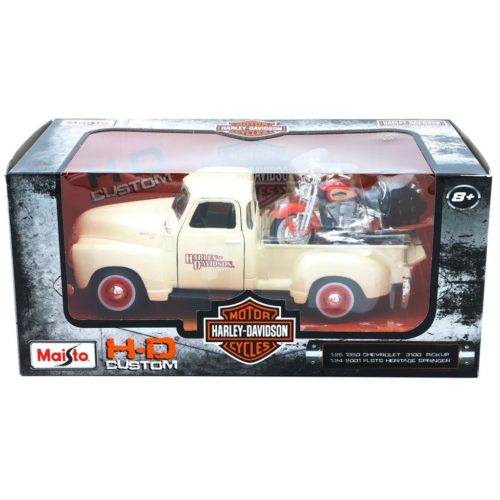 1950 Chevrolet 3100 Pickup med en Harley-Davidson 2001 FLSTS Heritage Springer på flaket. Bilen är i skala 1:25 (19,5 cm) och motorcykeln är i skala 1:24 (9 cm).