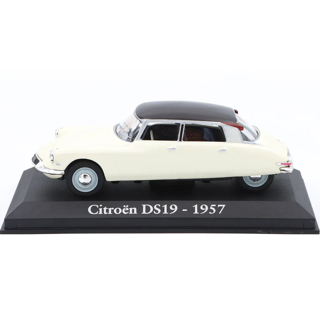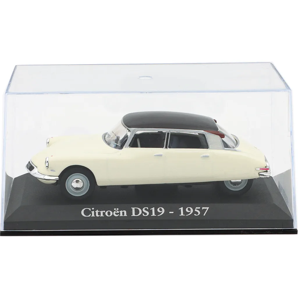 Vit/benvit Citroën DS19 med svart tak årsmodell 1957. Bilen är i skala 1:43 (10 cm) och framtagen av Atlas Editions.