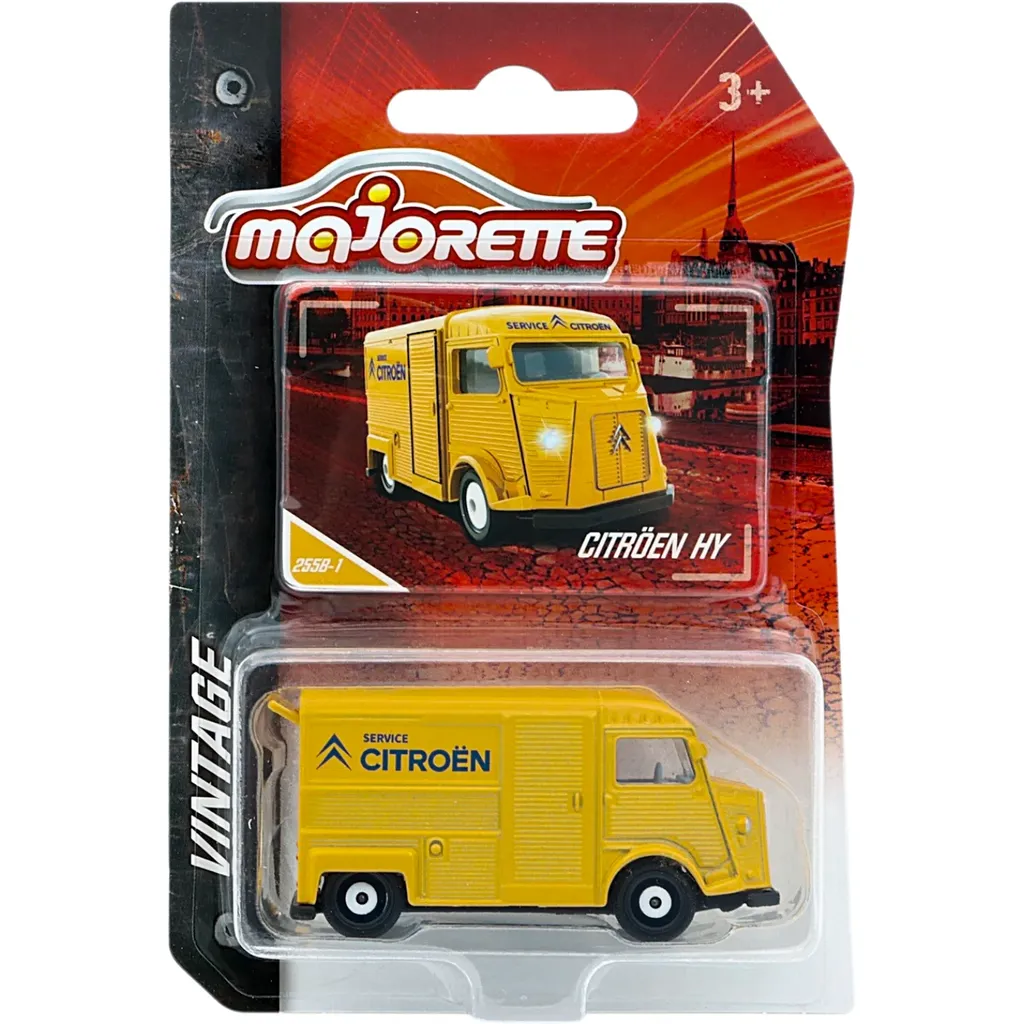 Gul Citroën HY (H Van) som ett servicefordon med texten "Citroën Service" från Majorette och serien Vintage. Vanen är 7 cm lång (skala 1:60).