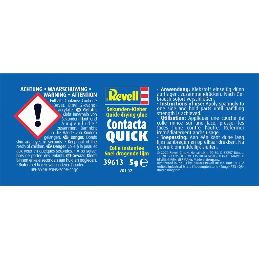 Contacta Quick är ett snabblim från Revell anpassat för limning av Revells plastbyggmodeller men fungerar även för andra material. Flaskan innehåller 5 gram snabblim.