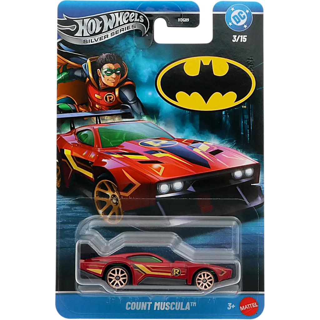 Röd Count Muscula från Hot Wheels Silver Series och Batman Series från 2026 där denna Count Muscula med Robin-tema är fordon 3/15.