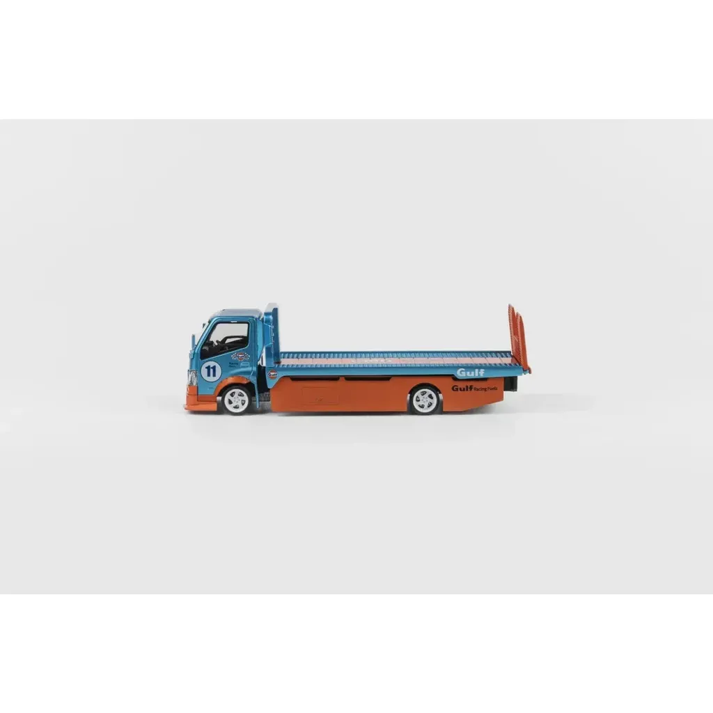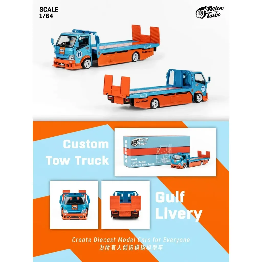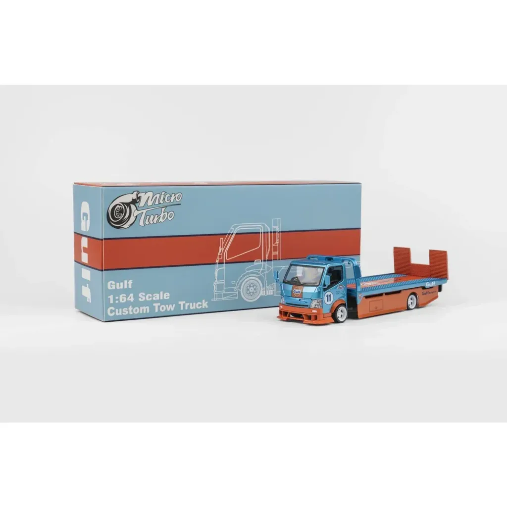 Custom Flatbed Tow Truck med Gulf-livery som modellbil från Micro Turbo i skala 1:64.