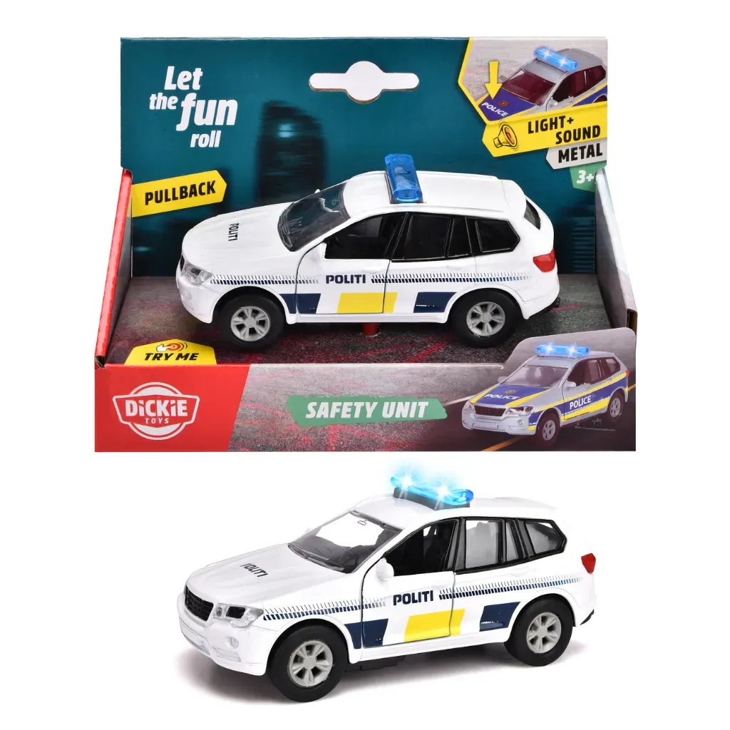 Dansk polisbil med ljud och ljus från Dickie Toys. Bilen är 12 cm lång och tillverkad i metall med plastdetaljer. Däcken är av gummi vilket ger bra grepp.