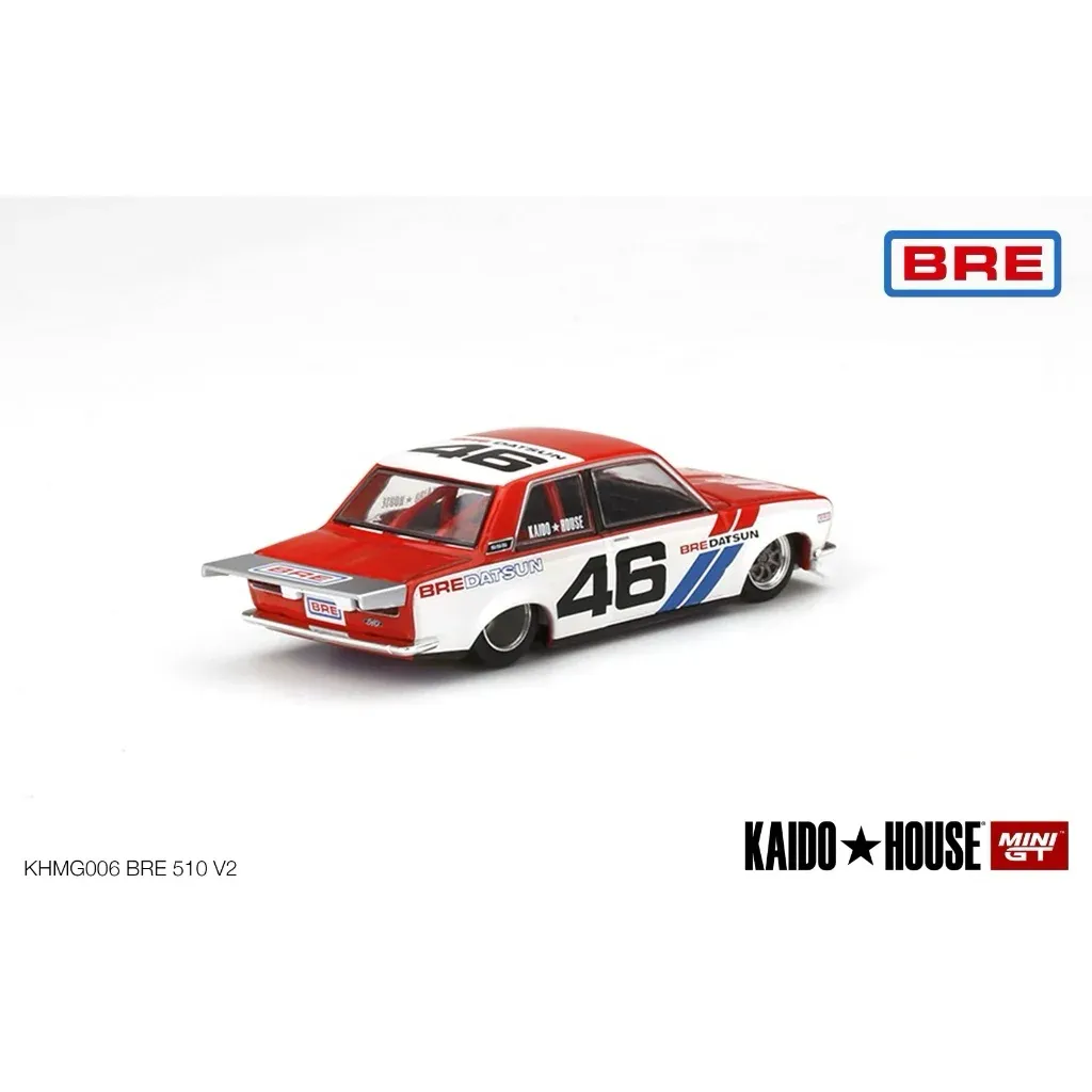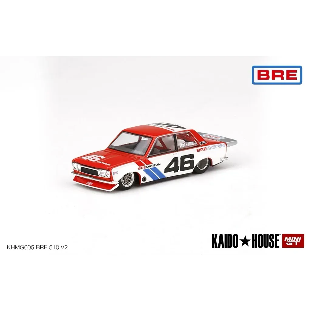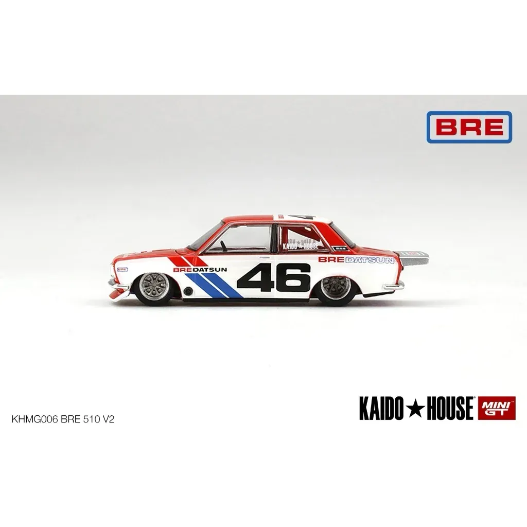 Datsun 510 Pro Street BRE510 V2 som modellbil från Mini GT och serien Kaido House. Modellen är tillverkad i metall med gummidäck och skalan är 1:64 (ca 7 cm). Bilen har en röd och vit lack.