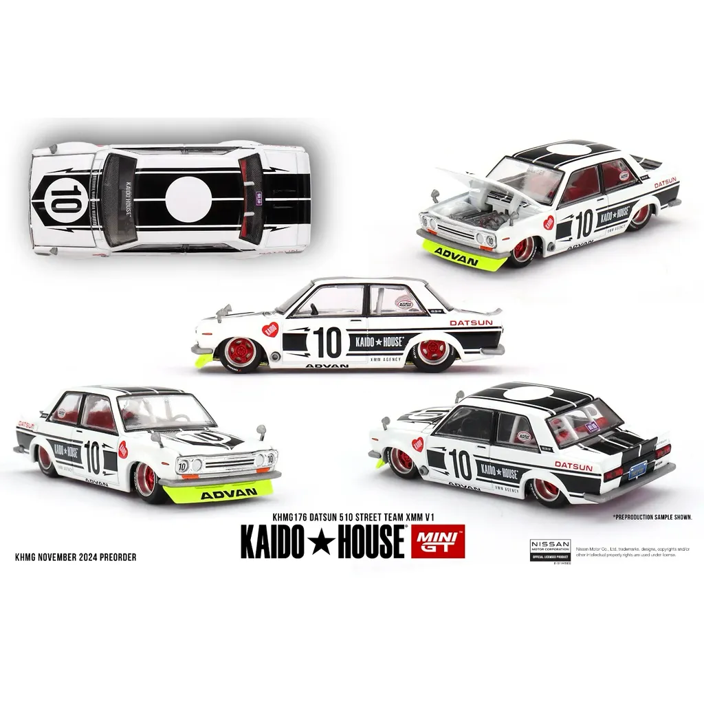 Datsun 510 Street Team XMM V1 som modellbil från Mini GT och serien Kaido House. Modellen är tillverkad i metall med gummidäck och skalan är 1:64 (ca 7 cm). Bilen har en vit lack med svart dekor och nummer 10.