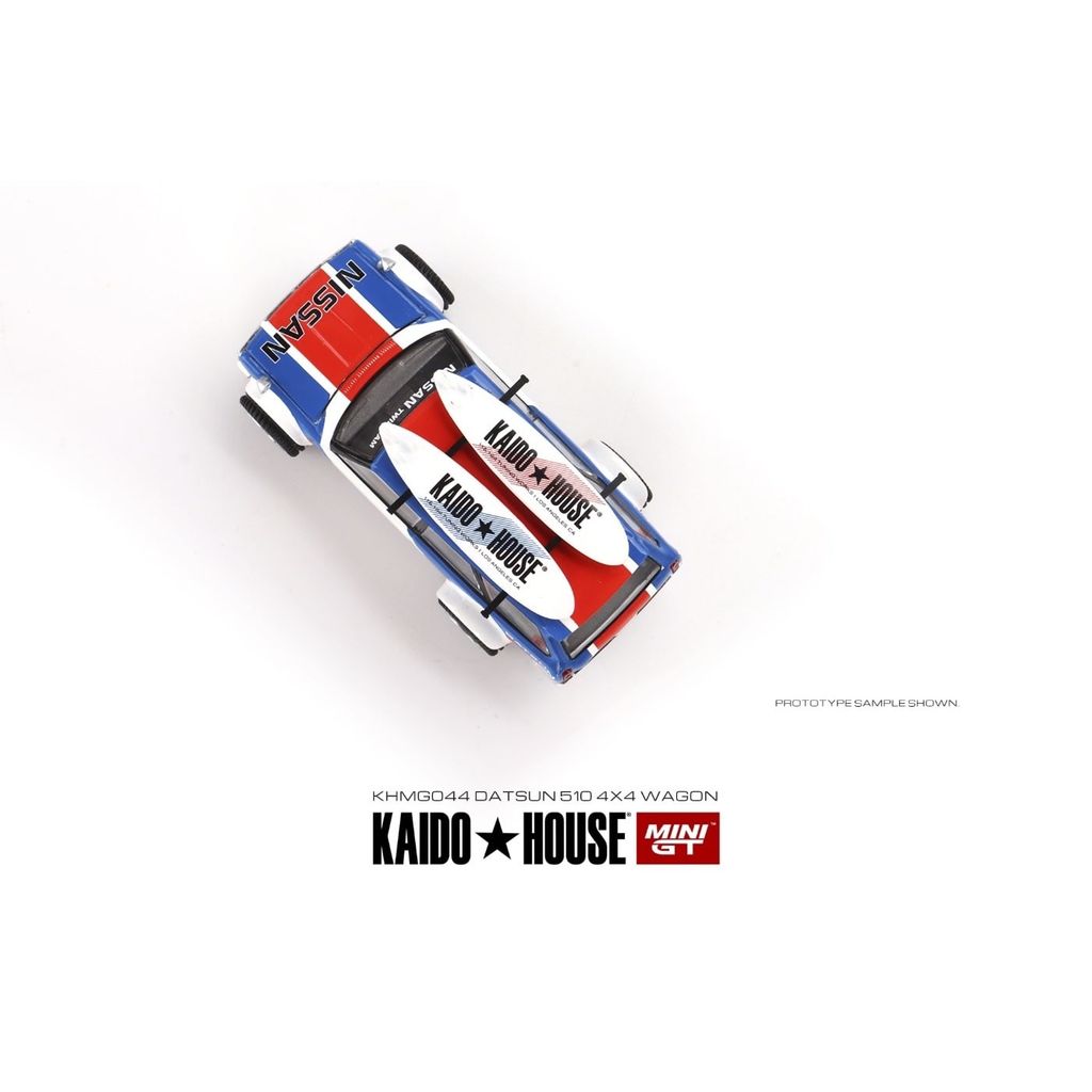 Vit, blå och röd Datsun 510 Wagon 4X4 Surf från Mini GT i samarbete med Kaido House. Den fina modellen är i skala 1:64 (ca 7 cm).
