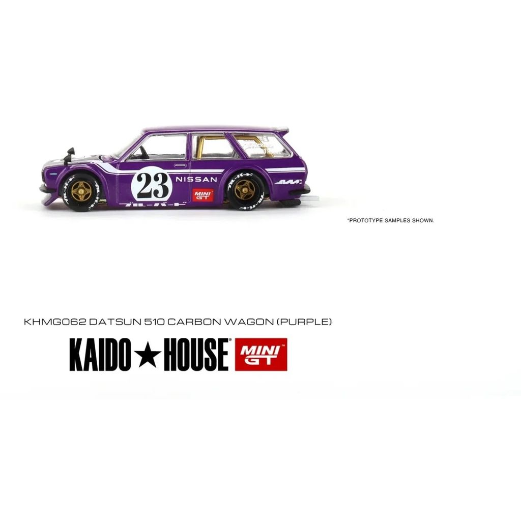 Datsun KAIDO 510 Wagon CARBON FIBER V1 är det fullständiga namnet på denna lilla lila modellbil från Mini GT och serien Kaido House i skala 1:64 (ca 7,5 cm).