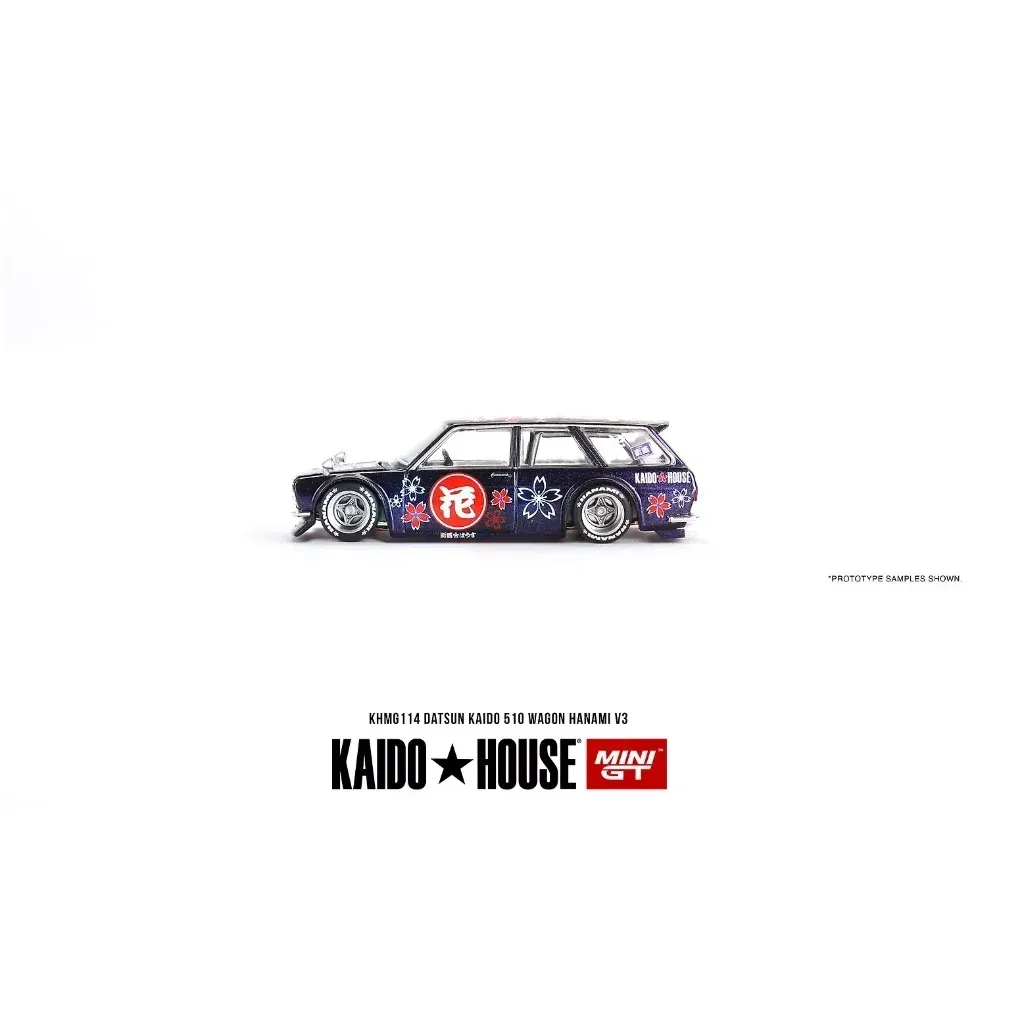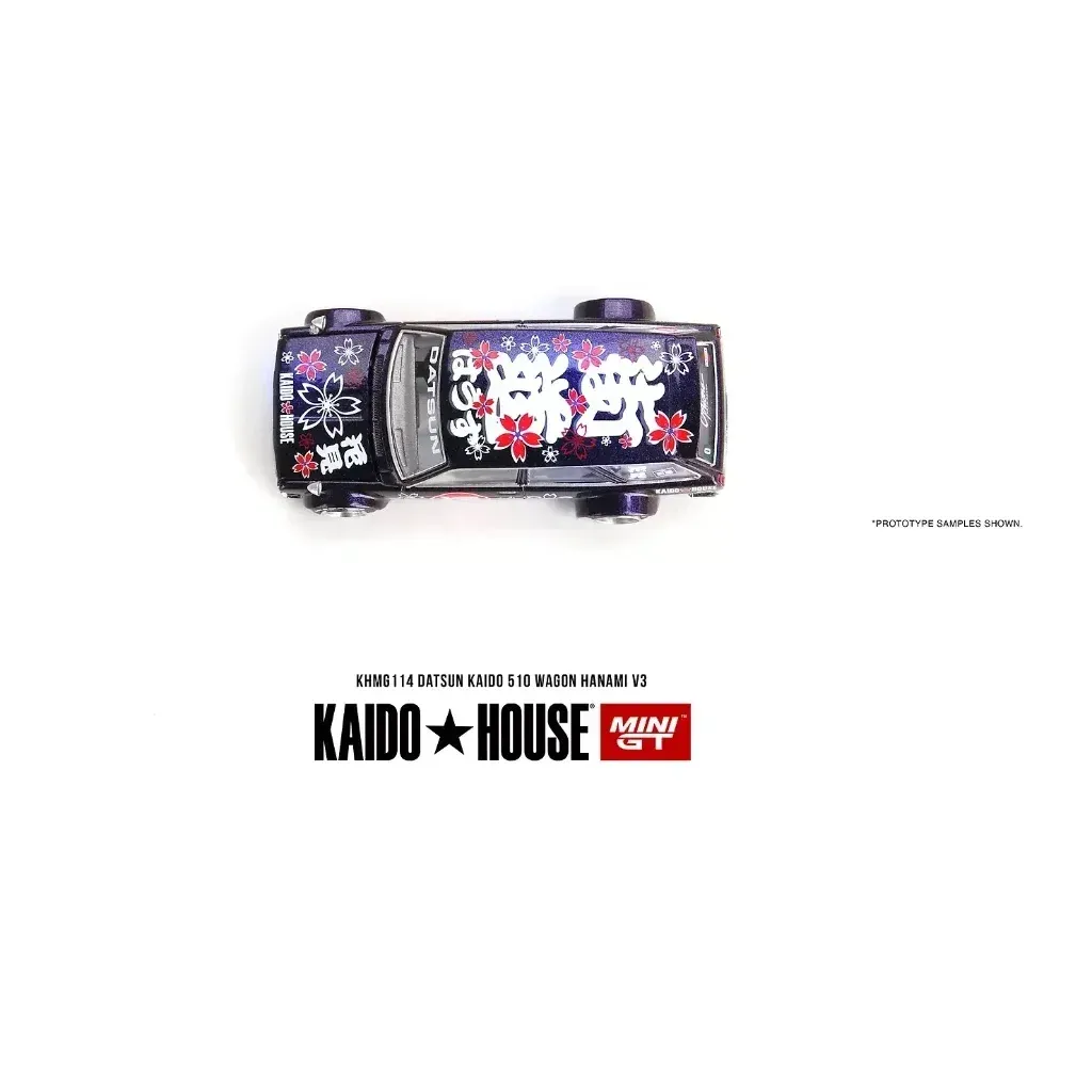 Datsun KAIDO 510 Wagon Hanami V3 i lila med blommor från Mini GT i samarbete med Kaido House i skala 1:64 (ca 7 cm). Motorhuven går att öppna.