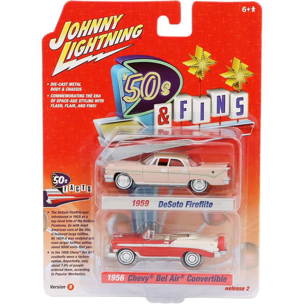 2-pack med bilar från Johnny Lightning i skala 1:64 (7-8 cm). Bilarna är en 1959 DeSoto Fireflite och en 1956 Chevrolet Bel Air Convertible.