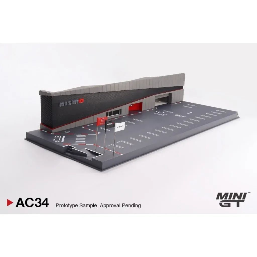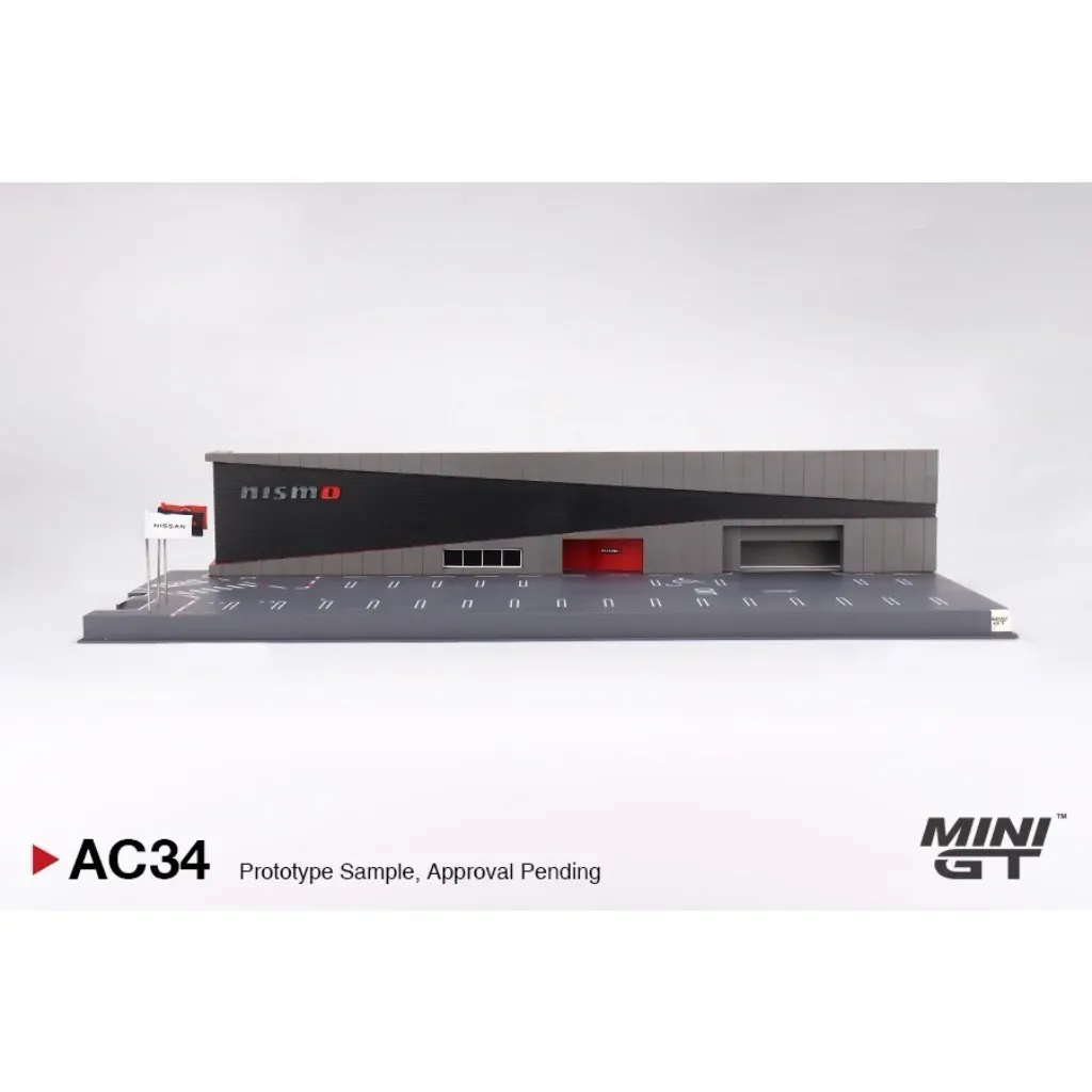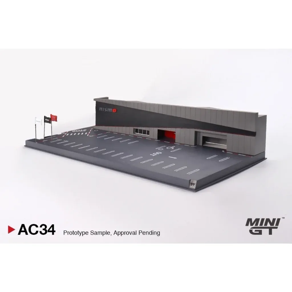 Dioramat består av en stor parkeringsyta och en garagebyggnad, Nissan Motorsports & Customizing Co., Ltd. Nismo Operation.