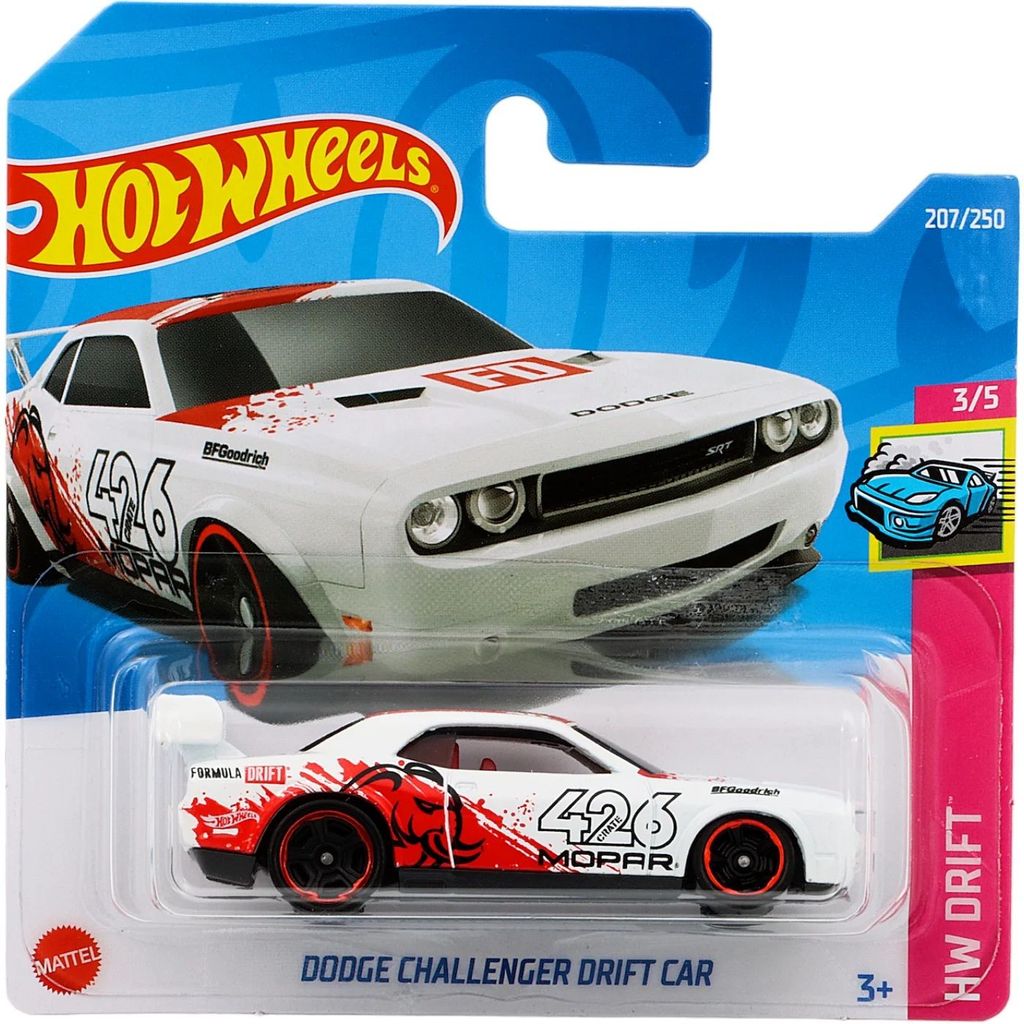 Dodge Challenger Drift Car från Hot Wheels och serien HW Drift där denna leksaksbil är bil nummer 3/5. Bilen är nummer 207/250 från 2022 och har ett short card (5785).