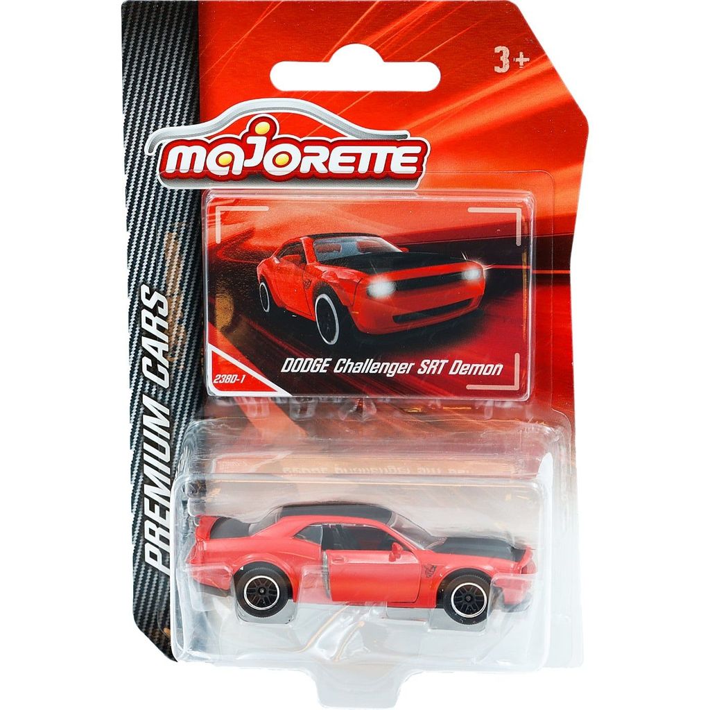 Röd Dodge Challenger SRT Demon från Majorette och serien Premium Cars. Skalan är 1:66 vilket ger oss ca 7,5 cm Dodge Challenger.