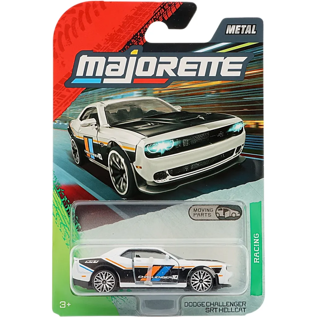 Dodge Challenger SRT Hellcat från Majorette och serien Racing Premium Cars. Bilen är 7 cm lång och tillverkad i metall med plastdetaljer.