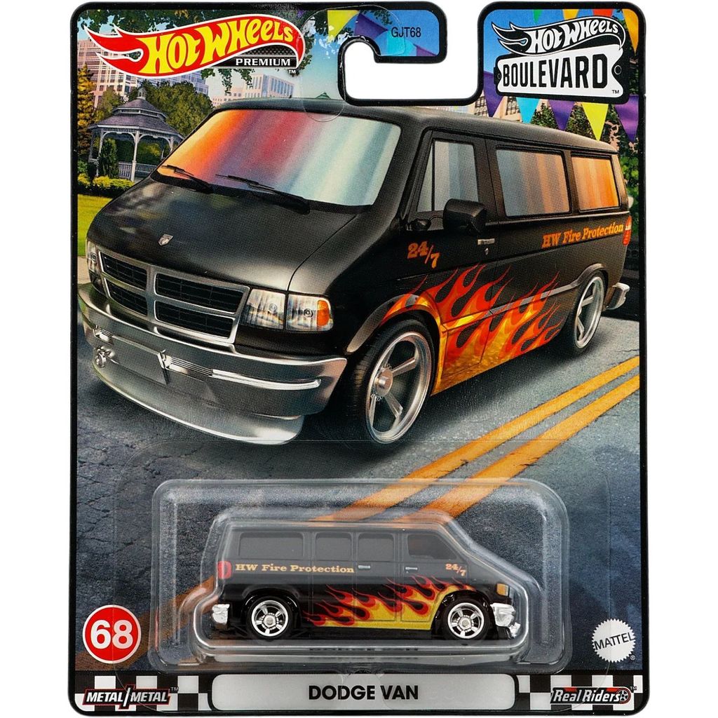Svart Dodge Van med flames från Hot Wheels. Bilen ingår i setet Boulevard, Mix 1, från 2023 där denna Dodge Van är bil nummer 68.