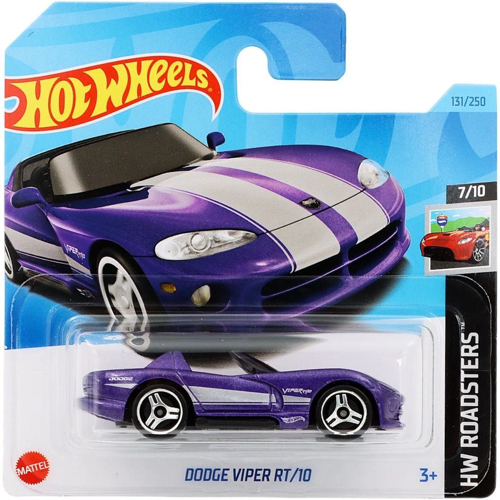 Dodge Viper RT/10 från Hot Wheels och serien HW Roadsters där denna leksaksbil är bil nummer 7/10. Sportbilens är nummer 131/250 från 2023 och har ett short card (5785). Bilens artikelnummer är HKK11. Just denna cabriolet ingår i bland annat L case 2023.
