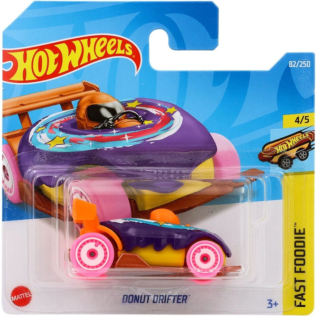 Donut Drifter från Hot Wheels och serien Fast Foodie där denna leksaksbil är bil nummer 4/5. Bilen är nummer 82/250 från 2022 och har ett short card (5785).