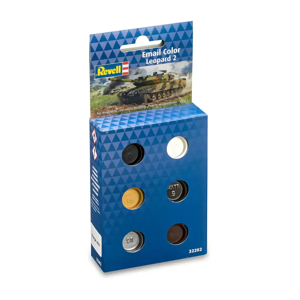 Färgset med sex emaljfärger anpassat för målning av stridsvagnen Leopard 2 A6M+ från Revell.